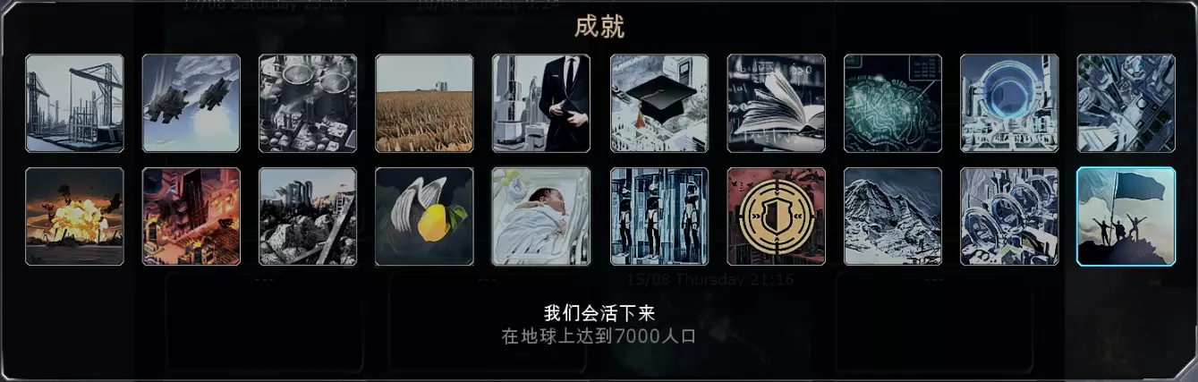 我们会活下来 描述:在地球上达到7000人口 达成方法:最快的方法就是把轨道空间站上的所有人口都搬到地球上(包括3个悬崖和冰封要塞),地球上4个地点的人口数加起来达到7000即可