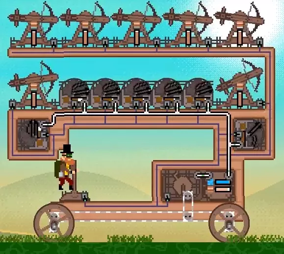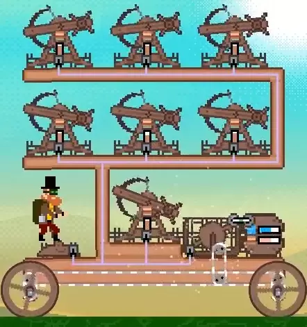现在我可以安装杠杆,像往常一样控制载具,同时用鼠标发射弩炮。可以在缆绳系统上再添加一个弩炮,这样就能同时射出两支箭。实际上,只要有足够空间,你可以在装置上添加任意数量的弩炮,就像这样: