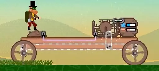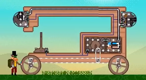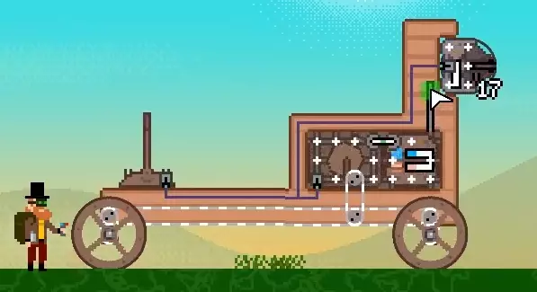 现在你需要为轨道炮提供蒸汽。幸运的是,载具上已经有一个为引擎供汽的锅炉,所以我们只需将轨道炮也连接到这个锅炉上。为此,我们需要使用管道。像这样将管道从锅炉拖到轨道炮。如果轨道炮和锅炉上的圆点变绿,就说明连接成功了。