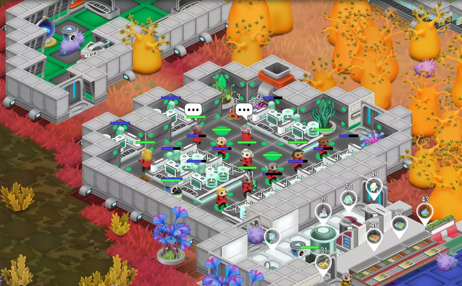 如果你计划研究每一项升级,那么你需要的研究站数量会比你想象的要多。一旦升级开始需要10万以上的点数,至少需要10-15个研究站才能在合理时间内完成。将研究站建在宿舍、餐厅和一些淋浴间附近是个不错的主意,这样可以最大限度地增加研究人员专注于任务的时间。