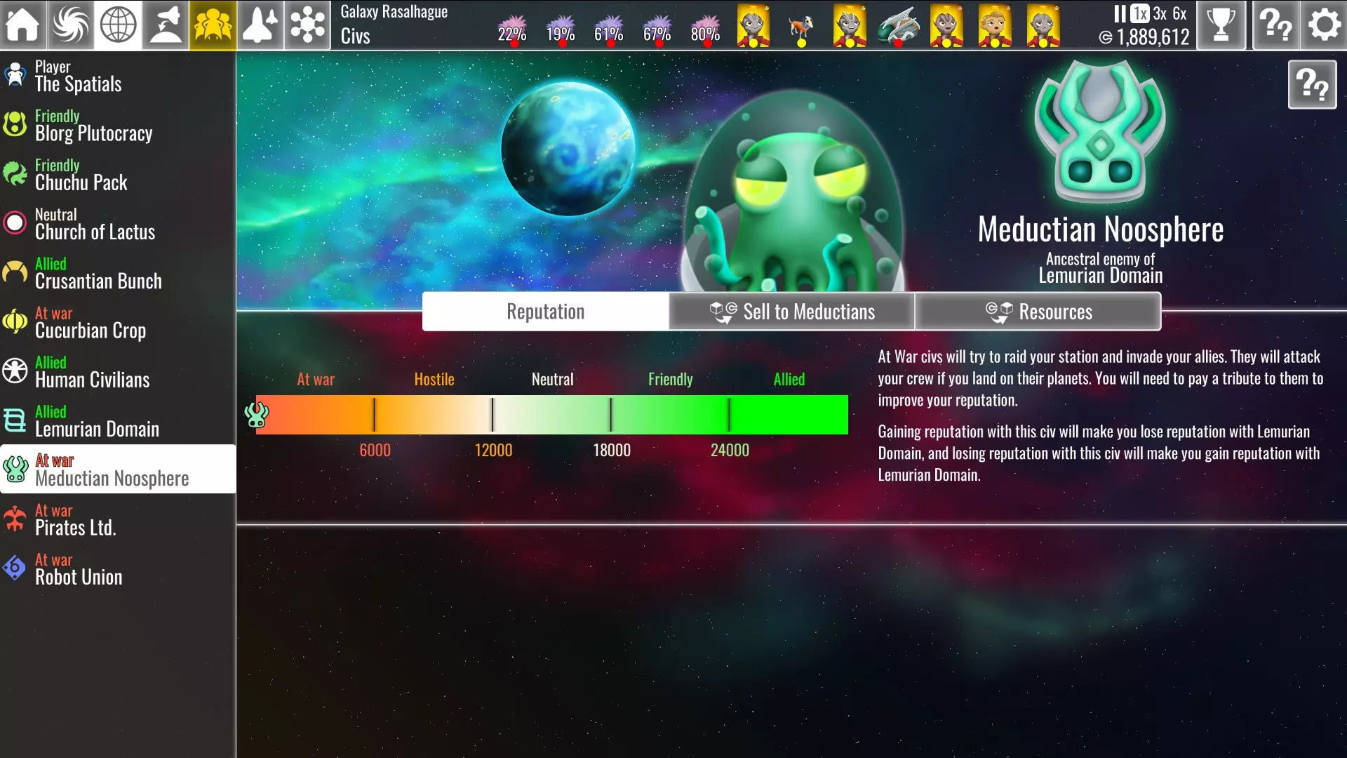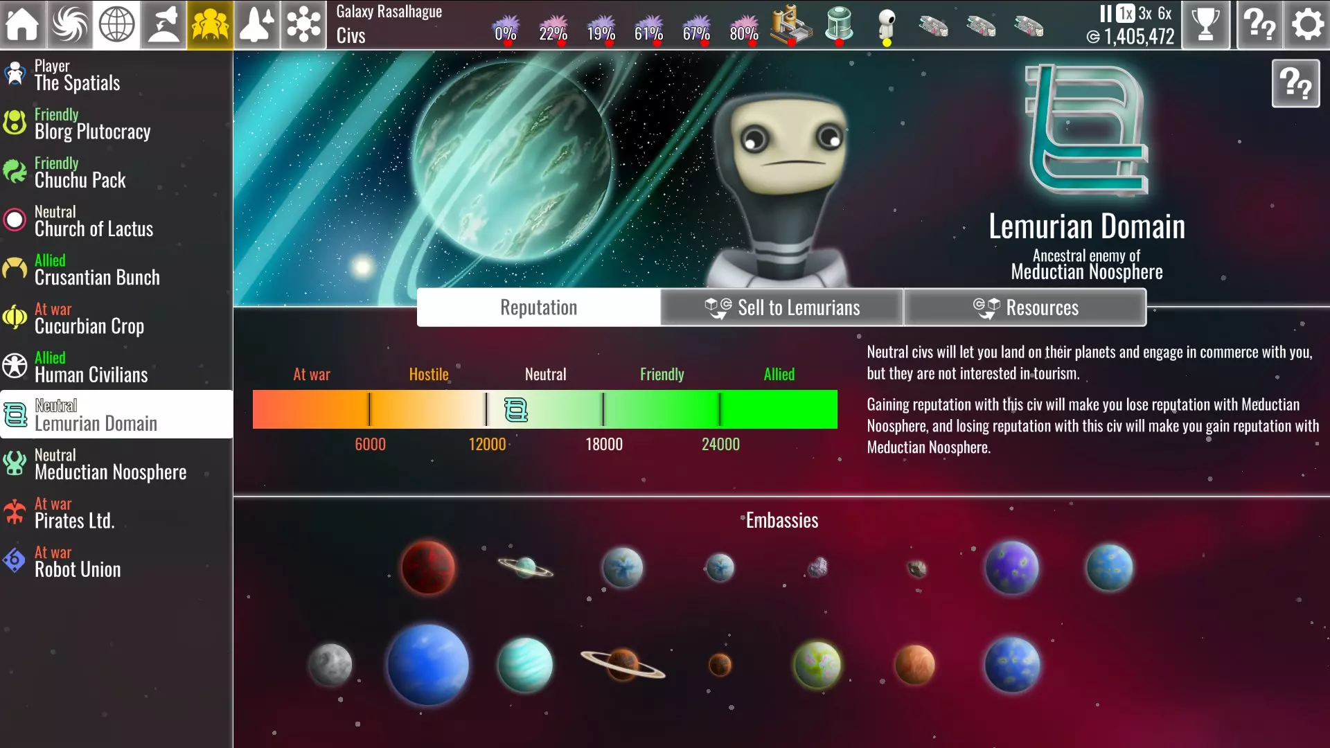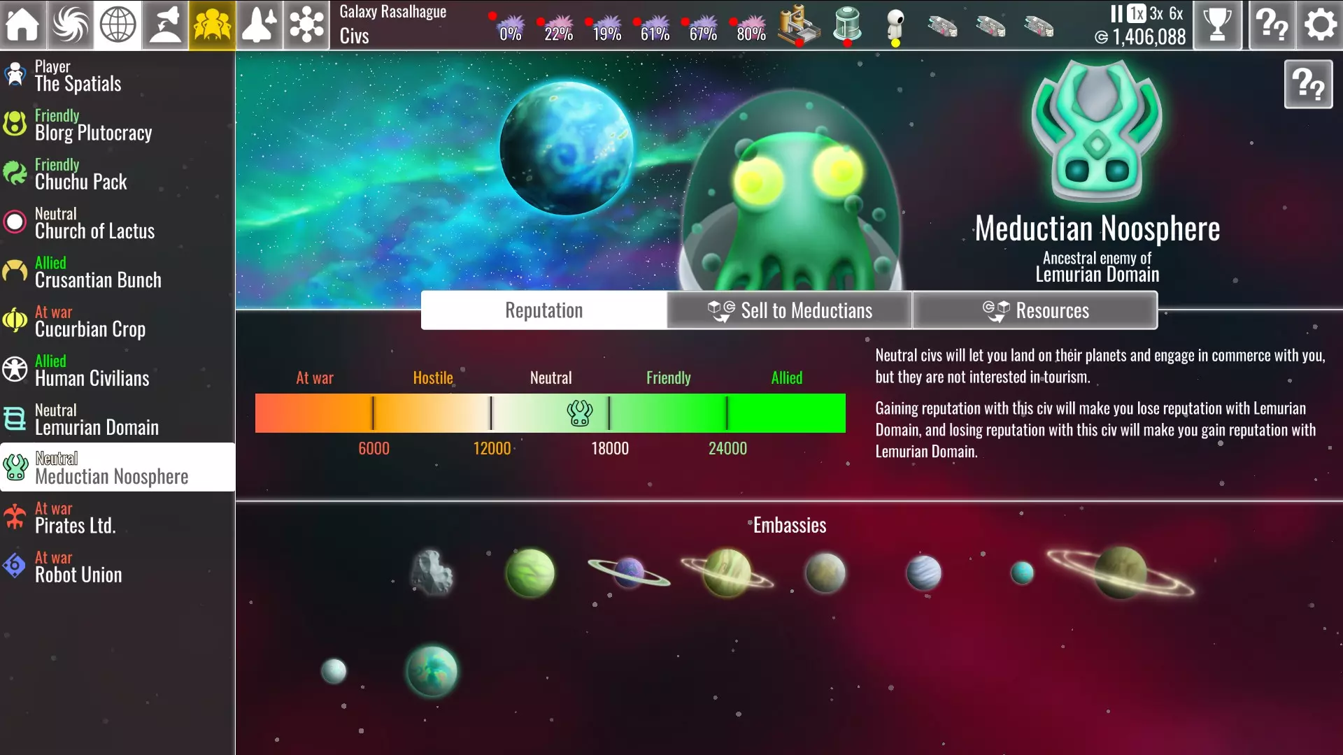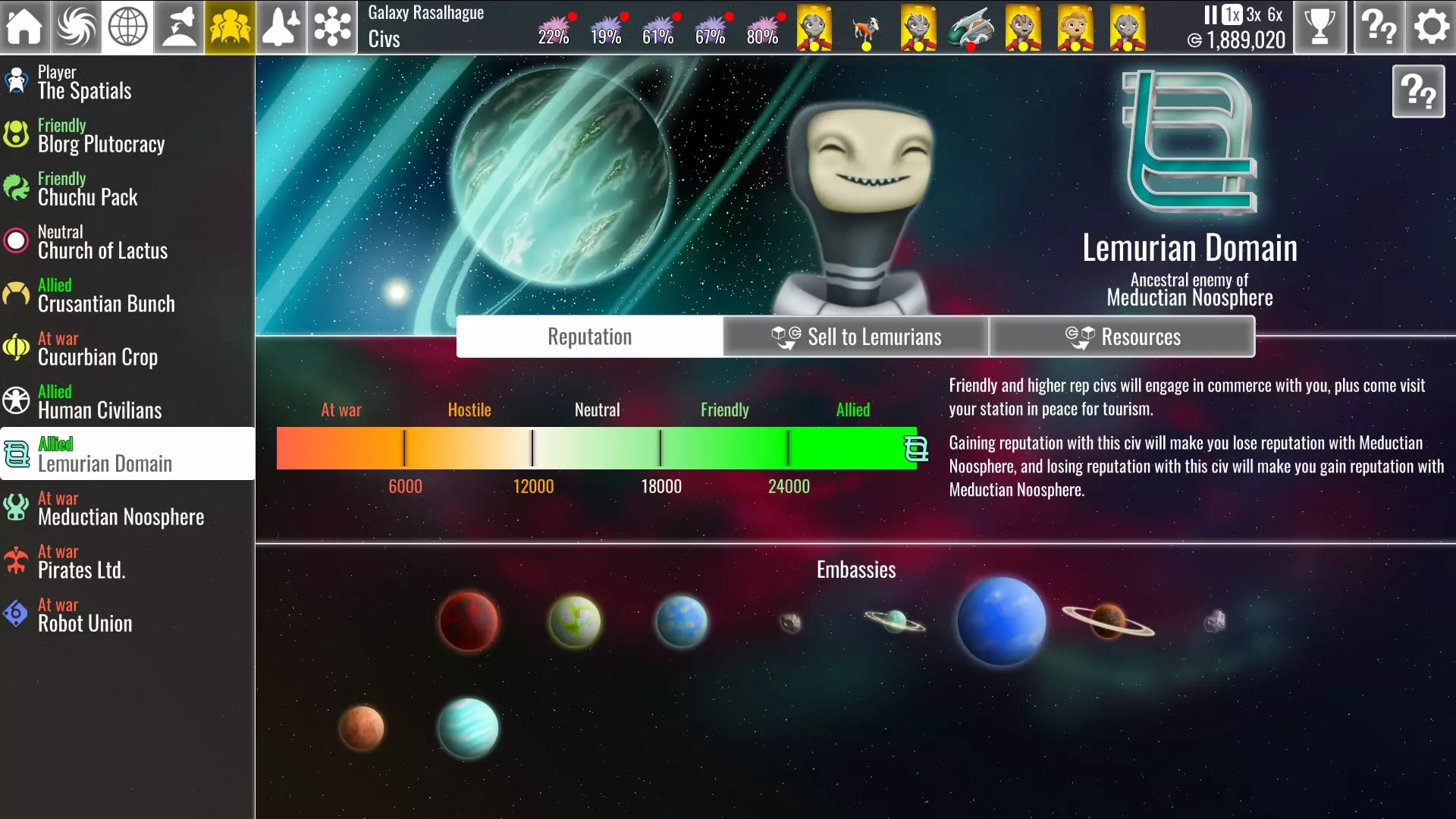 在银河地图上,任何设有大使馆的行星下方都会显示此符号。 为银河带来和平 某些文明彼此极为厌恶,因此不可能同时与双方保持友好关系。你最多只能期望保持中立。这种动态为你带来了一些需要做出的选择。 如果你与其中一方关系友好,另一方将对你抱有敌意,最终甚至会宣战。你可以通过旅游业从友好文明那里获得 credits 和好感,但你将无法获取其世仇所占据星球上的资源和贸易机会——除非你征服这些星球。此外,与你处于战争状态的任何文明都会对你的基地进行定期突袭。如果你的势力与两个文明的关系均为中立,那么这两个文明都不会允许游客访问你的空间站,但你可以在他们所有的星球上获取资源并进行贸易,不过从中立星球进口商品的关税比从同盟星球进口要高出75%。同时,这两个文明都不会袭击你的基地。 银河中立 要实现和平,你必须首先与其中一个文明的外交关系提升至最高。你可以通过建造大使馆来实现这一点,直到该文明对你足够友好并允许游客访问。游客和贸易活动将缓慢提升你们的关系,直至达到同盟状态。
