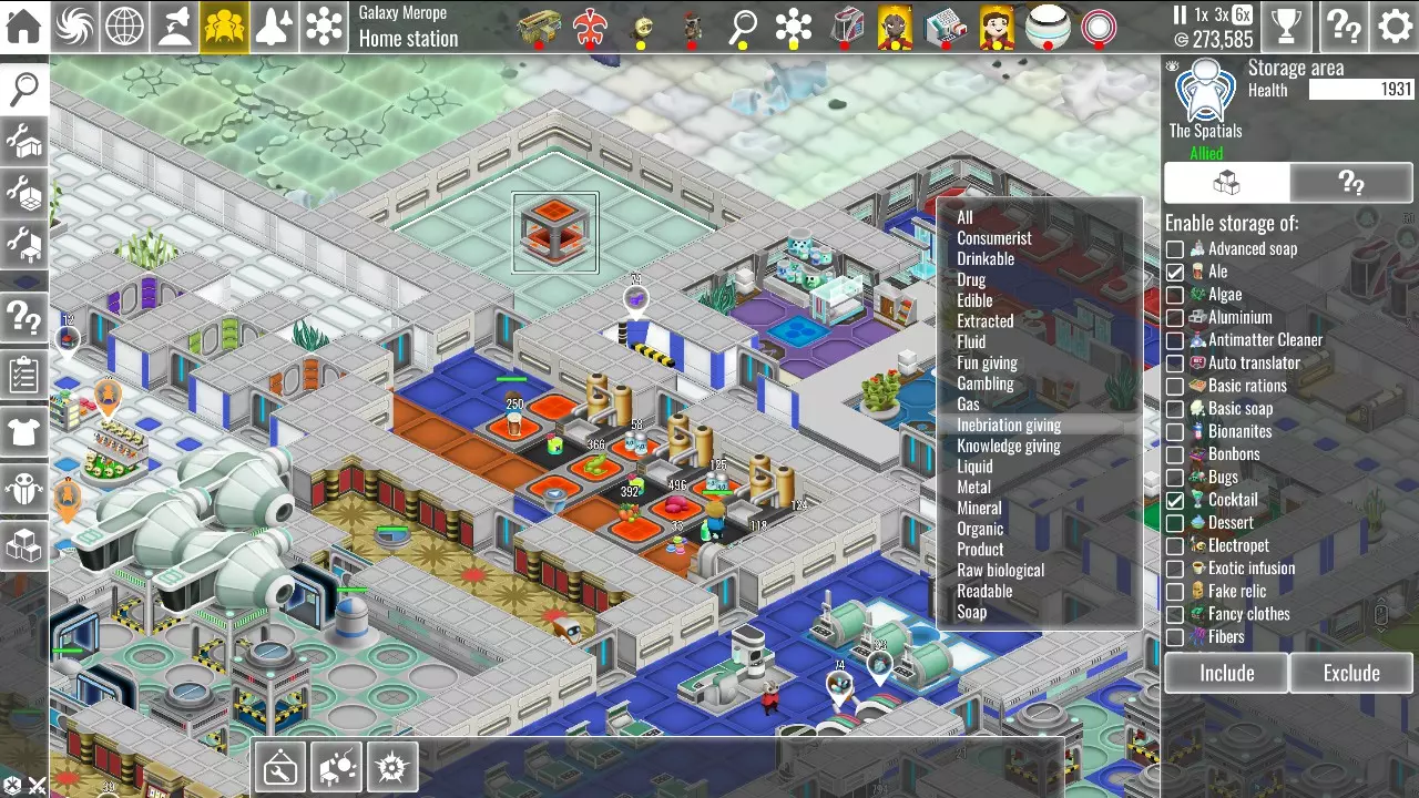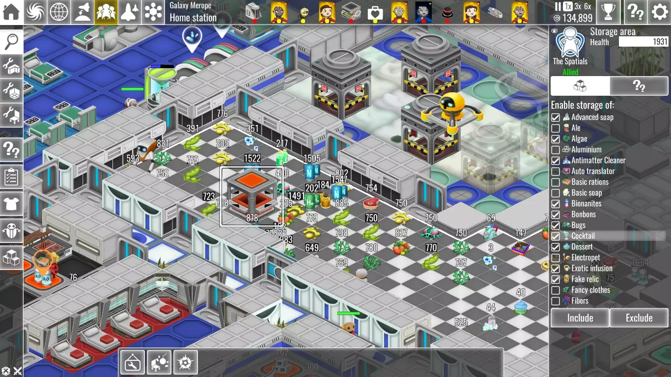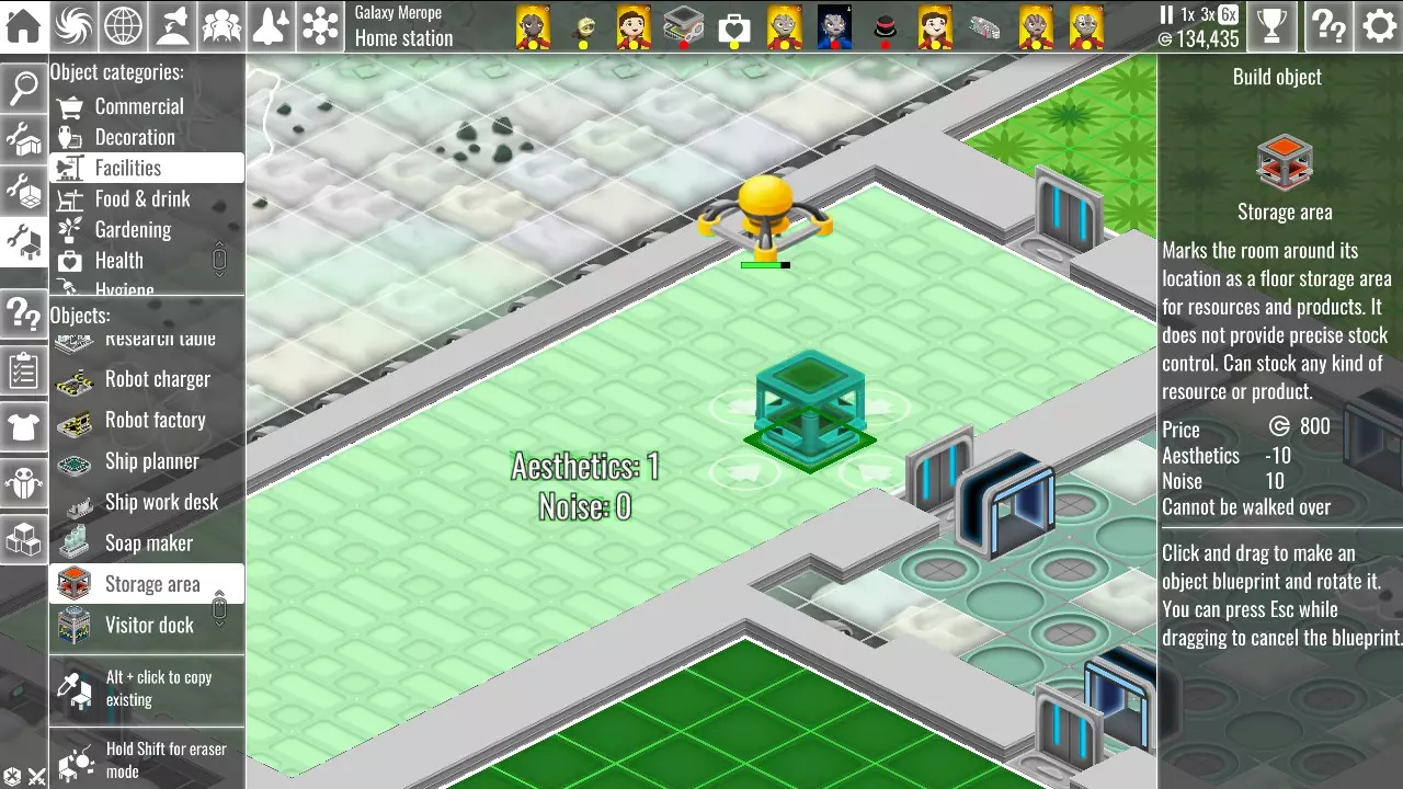 这些东西确实很方便,但它们会占用大量空间,而且体积越大,效率就越低。如果你发现你的船员需要频繁往返于存储区,你可以在他们的工作区附近放置一些托盘来存放他们所需的物品。 要创建存储区,首先需要建造一个房间。请注意,一旦将该空间设为存储区,你将无法在其中建造任何其他物体。