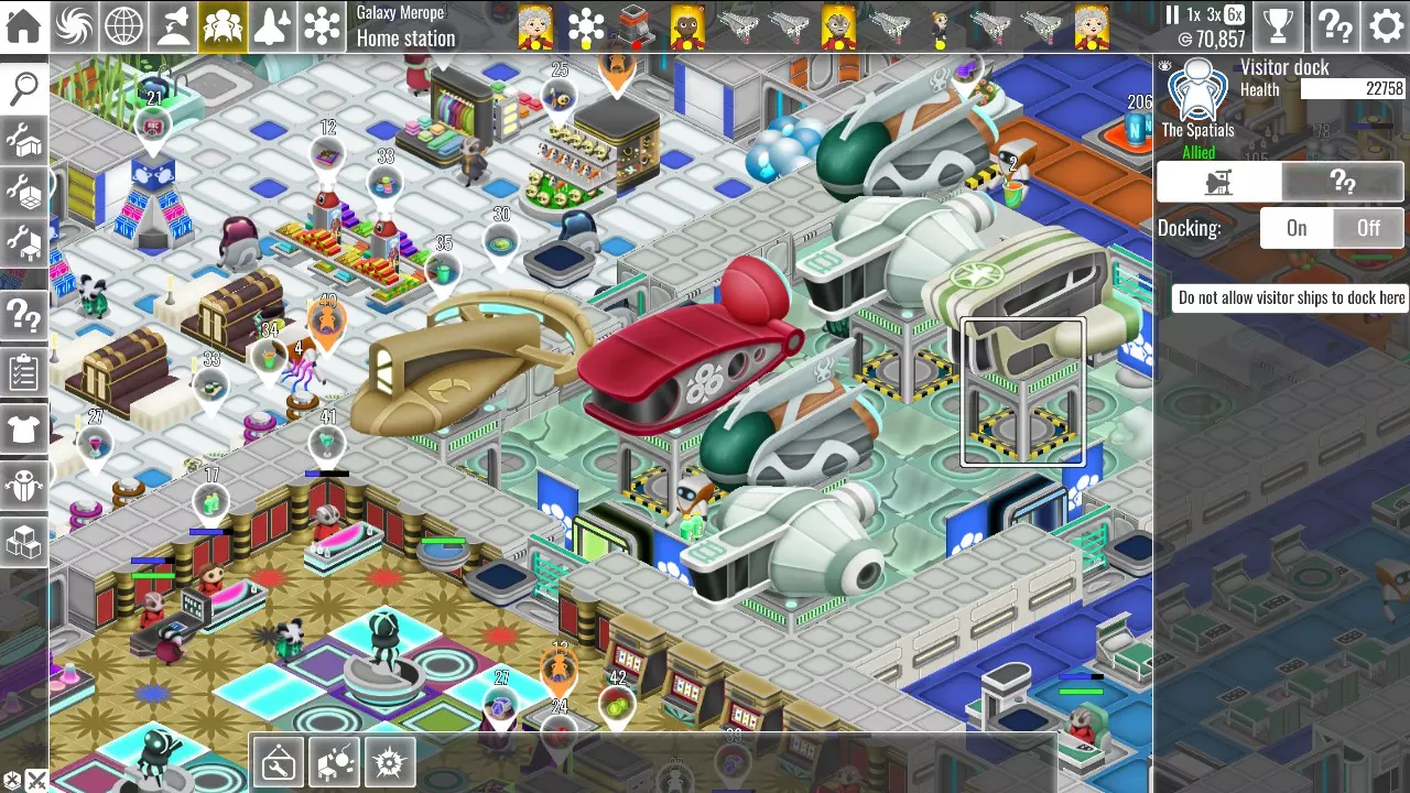 接待游客是一项重要的收入来源,但当你拥有十个或更多活跃的访客码头后,情况很容易失控。一个全面运转的空间站随时可能有超过一百名游客。如果你发现你的船员难以同时满足自身需求和游客的要求,或许可以让他们休息一下,有机会喘口气。 操作非常简单: 1. 点击你想要暂时关闭的访客码头。 2. 进入停靠界面,选择关闭。这样游客将无法使用该码头,直到你重新开启它。