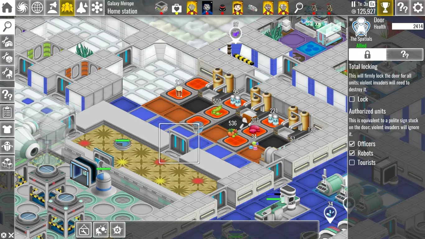 选择谁有权使用特定的门是防止访客偷窃你的物品,以及防止你的员工使用本为访客准备的昂贵物品的好方法。选择你想要设置的门,你会在【授权单位】下方看到一个勾选列表。默认情况下,所有门和安全门都允许所有人进入:员工、机器人和游客。取消勾选你不希望使用该门的群体,他们将无法再通过。选择【锁定】则拒绝所有人进入,包括敌人。