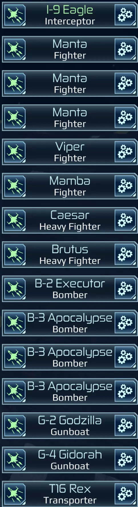 - G-2哥斯拉 推荐武器装备: - 2门40毫米机炮(反物质弹药) - 导弹发射器(G8导弹) - 4门等离子炮 - 注意:不推荐使用炮艇机。它们的作用很容易被拦截机替代和补充。在多次战斗中,炮艇机已被证明是舰队中最先撤退的单位。不建议大量使用它们。 运输舰 (高级) 推荐舰船: