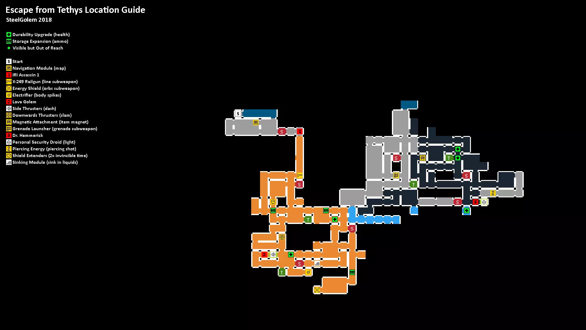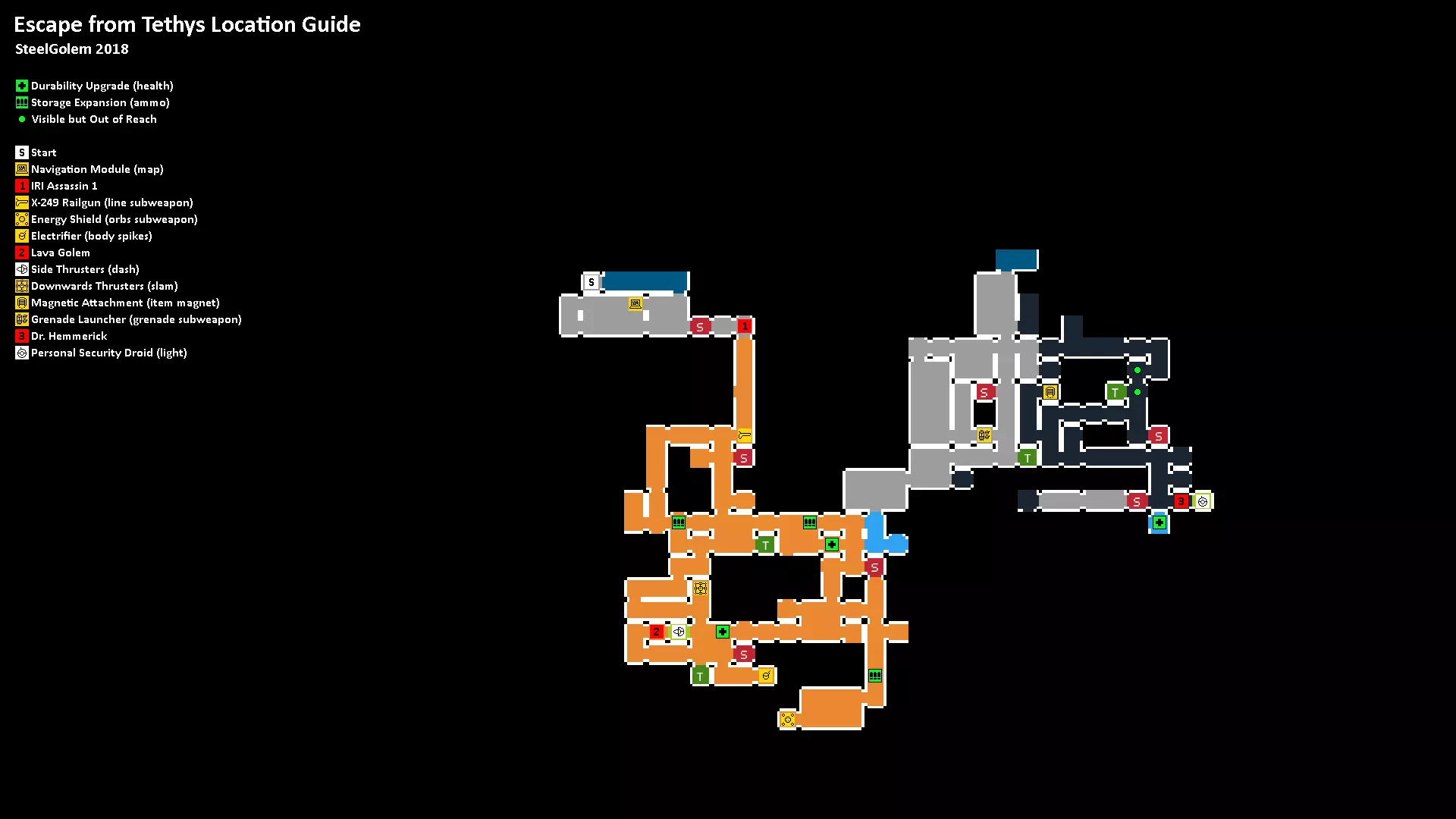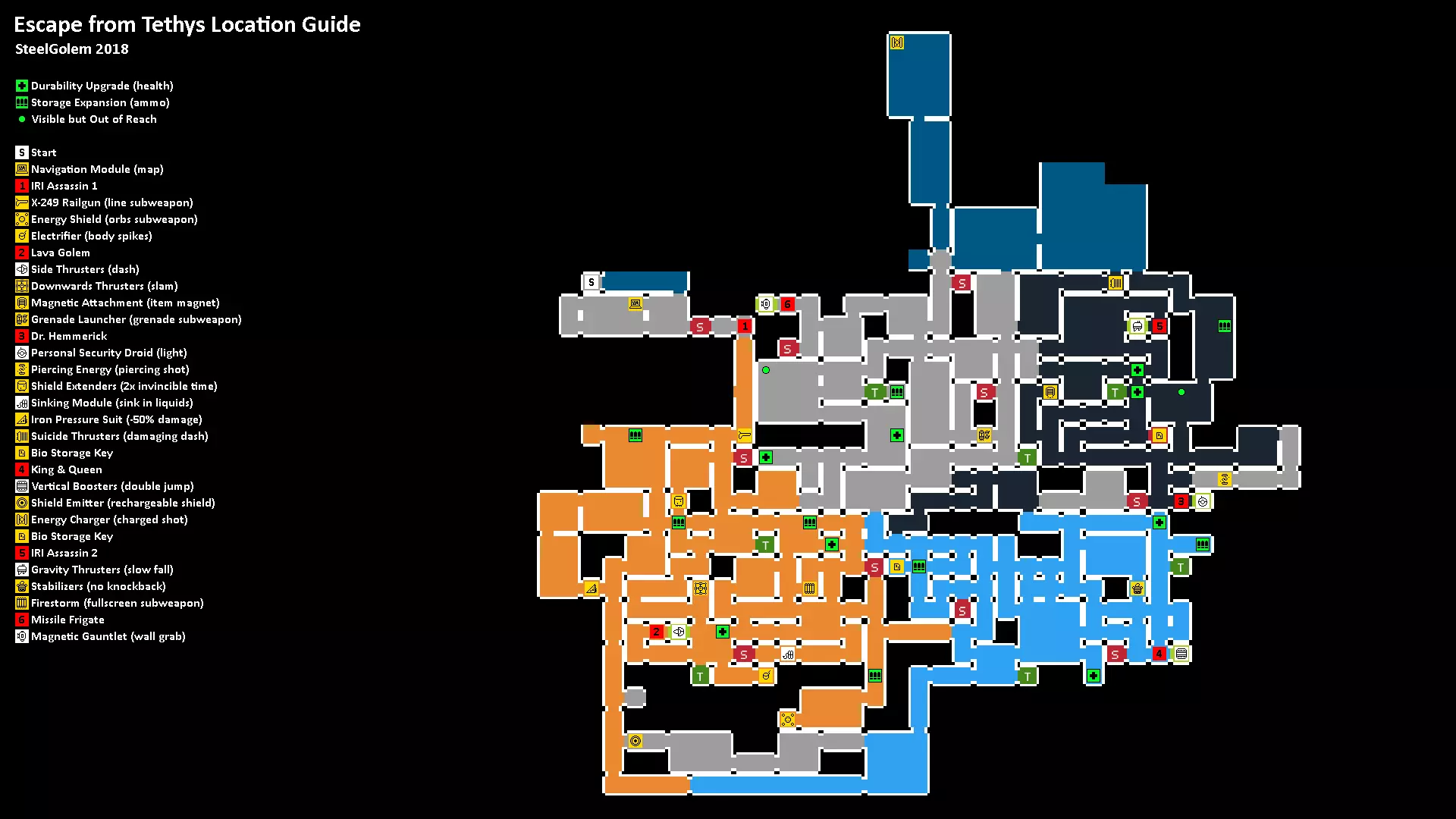 所有升级和首领的位置地图。每张地图会根据你在主升级路径中的进度,显示当前可用的所有内容。 直至【侧推进器(冲刺)】的所有内容