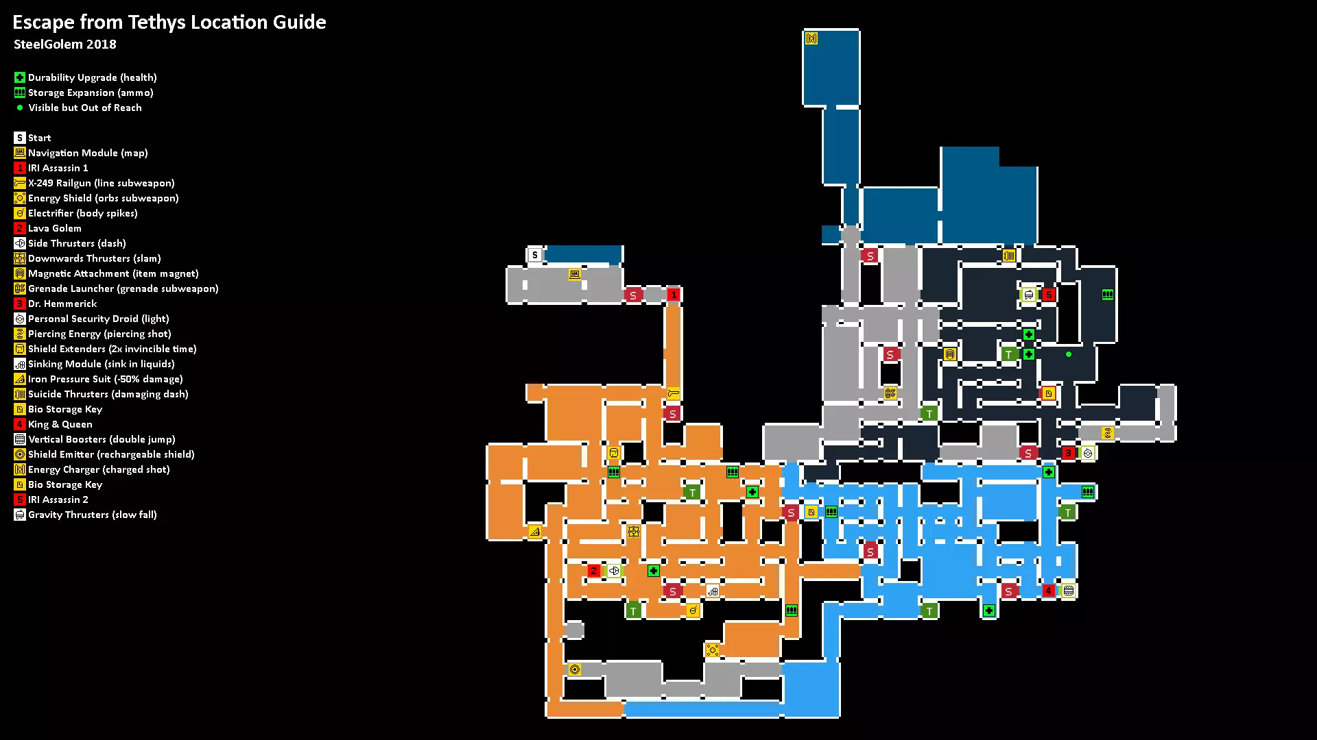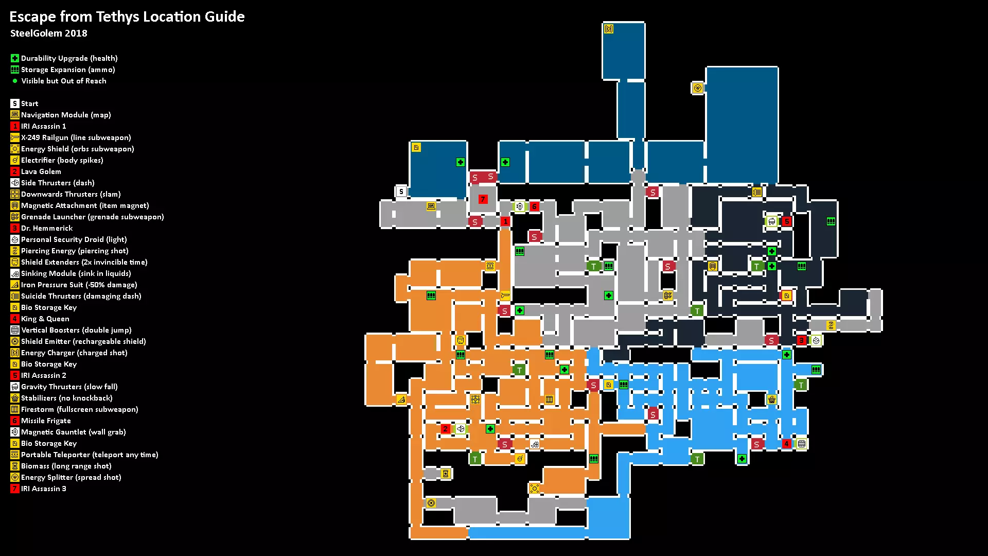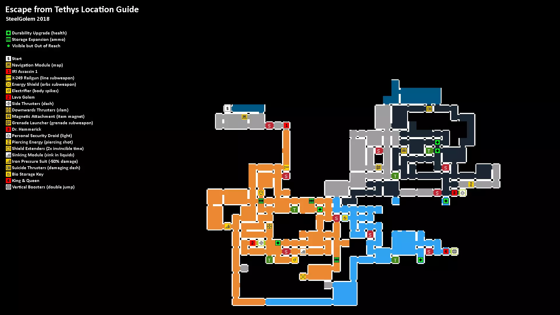 所有升级和首领的位置地图。每张地图会根据你在主升级路径中的进度,显示当前可用的所有内容。 直至【侧推进器(冲刺)】的所有内容
