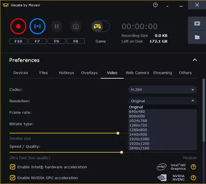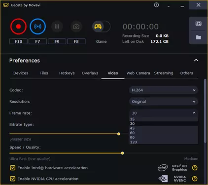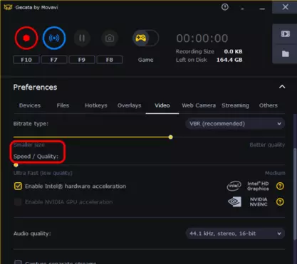 比特率类型。比特率是指录制视频每秒的比特数。您可以在两种比特率类型中选择——可变比特率和恒定比特率。 第一种是VBR(可变比特率)。游戏画面的比特率也是变化的。例如,加载界面的比特率远小于动态场景的比特率。 我们默认推荐VBR有两个原因: 1. 程序运行会更稳定。 2. 最终视频文件会比使用高比特率CBR的视频更小。 请注意,您可能会错误地选择CBR。看似比特率已足够高,但当您开始玩射击游戏时,动态场景的比特率会高于您所选择的数值,这意味着视频质量会变差。类似的情况是当你录制策略类或卡牌游戏时使用高比特率。屏幕上没有动态画面,但设置中的高比特率反而会导致画质变差。此外,处理器负载会很重,就像录制射击游戏一样。 更小文件体积:速度/质量。这是另一项比特率设置。 这项设置操作简单。将滑块向左移动可减小视频文件体积并降低画质,这样还能减少帧率卡顿。画质越高,录制过程中程序消耗的资源就越多,帧率卡顿也会越严重。对于Gecata,我们根据经验选择了最佳设置。