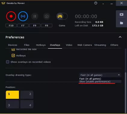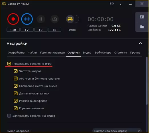 本指南介绍了最常见的用户问题。我们选取了最常见的场景(游戏录制、直播和导出),为你讲解如何解决这些问题。这将帮助你更好地了解Gecata的功能,并学会如何流畅、无故障地使用该程序。 如何防止录制时程序崩溃 游戏过程中程序尝试显示覆盖层时,常出现此问题。 解决方法: 1. 关闭覆盖层。操作步骤如下: 打开设置菜单。 进入覆盖层选项卡。 取消勾选【在游戏中显示覆盖层】。
