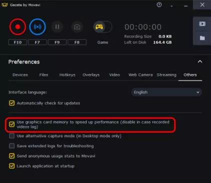 速度/画质:将滑块向右拖动可获得最佳画质,但视频体积也会相应增大。软件默认已设置为“理想参数”。 其他设置 加速:若您的设备搭载Intel或Nvidia Nvenc,可启用加速功能。这能提升录制速度并降低系统占用。您也可通过“其他”选项卡中的设置调整录制速度。 音频质量:选择音频质量。 分别捕获流:单独录制游戏画面和网络摄像头画面。若关闭网络摄像头但仍勾选此选项,仍会生成两个视频文件:音频和游戏画面。 显示光标:在录制内容中显示鼠标光标。 使用显卡内存提升性能:此选项可减少系统资源占用,但有时可能导致录制问题。它默认处于开启状态。