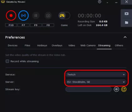 打开Gecata。进入【流媒体】选项卡,在【服务】复选框中选择Twitch。在【服务器】复选框中选择合适的服务器。然后在设置选项卡中选择该服务器。
