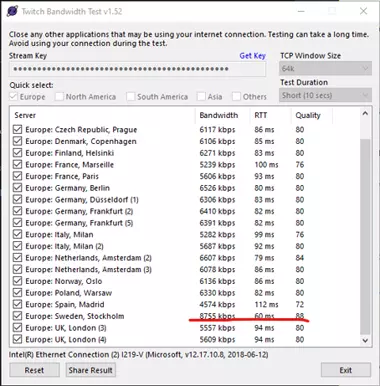 由于每个人的电脑配置和游玩的游戏都不同,很难找到完美的设置。你需要尝试不同的设置来找到最适合自己的组合。利用屏幕上的信息来选择适合你的设置。 如何不间断录制直播 我们以Twitch直播为例。 你需要关注的主要指标是网络连接带宽和服务器延迟。 在Gecata中,无法自动选择服务器,因此需要手动选择合适的设置。我们建议你使用Twitch带宽测试工具来找到合适的服务器。该工具会根据你的网络连接速度和延迟选择合适的服务器进行录制。 以下是你需要做的步骤: 下载并解压该工具启动程序,选择合适的测试区域(可以全选),然后启动测试。选择合适的延迟和连接速度选项。在我们的示例中,选择的是斯德哥尔摩。
