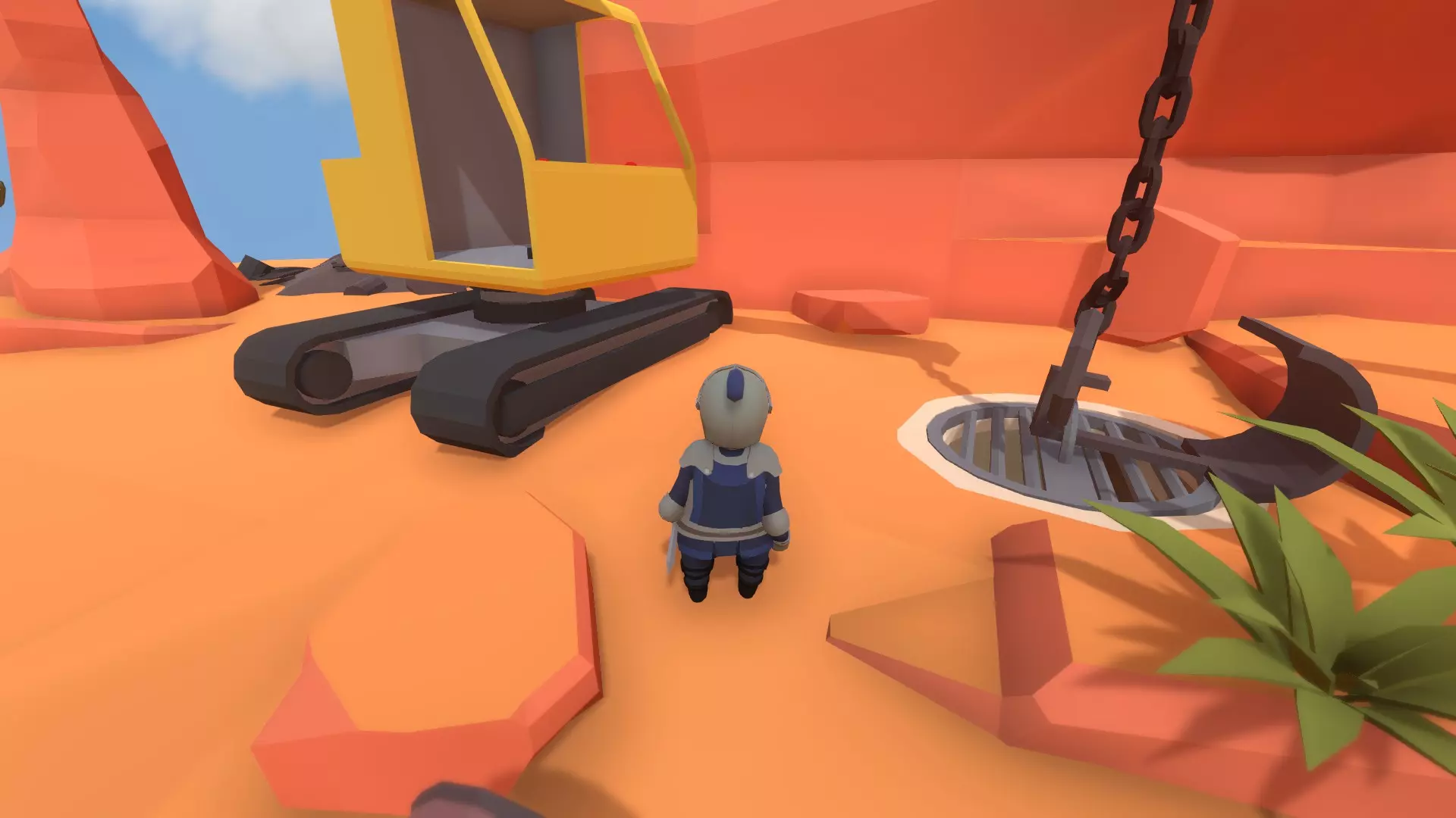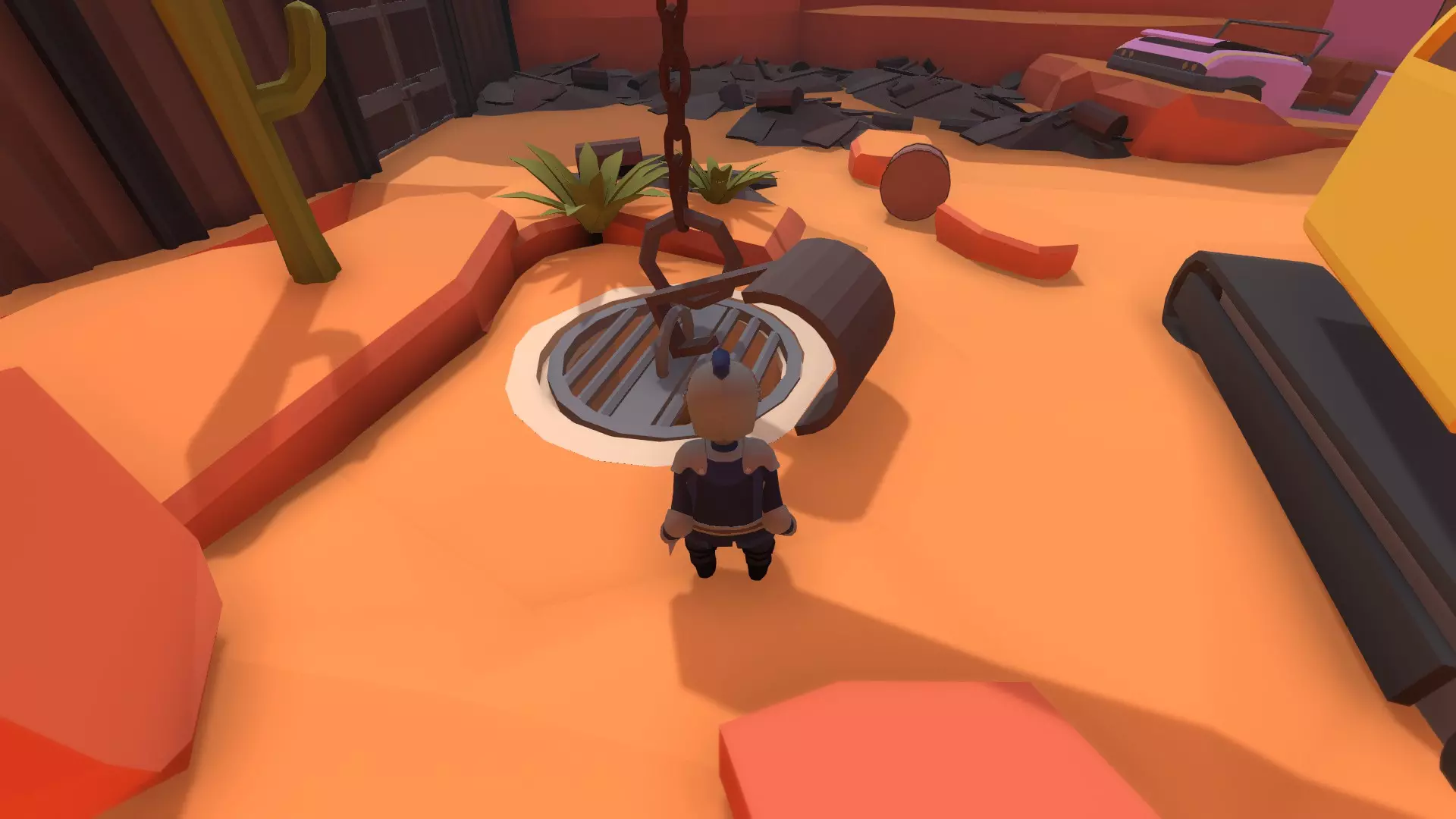 移开石头,使用起重机上的铲子锁定下水道门和起重机吊环。绕到建筑后方,从右侧的箱子里找到链条,使用它会让操作更简单。