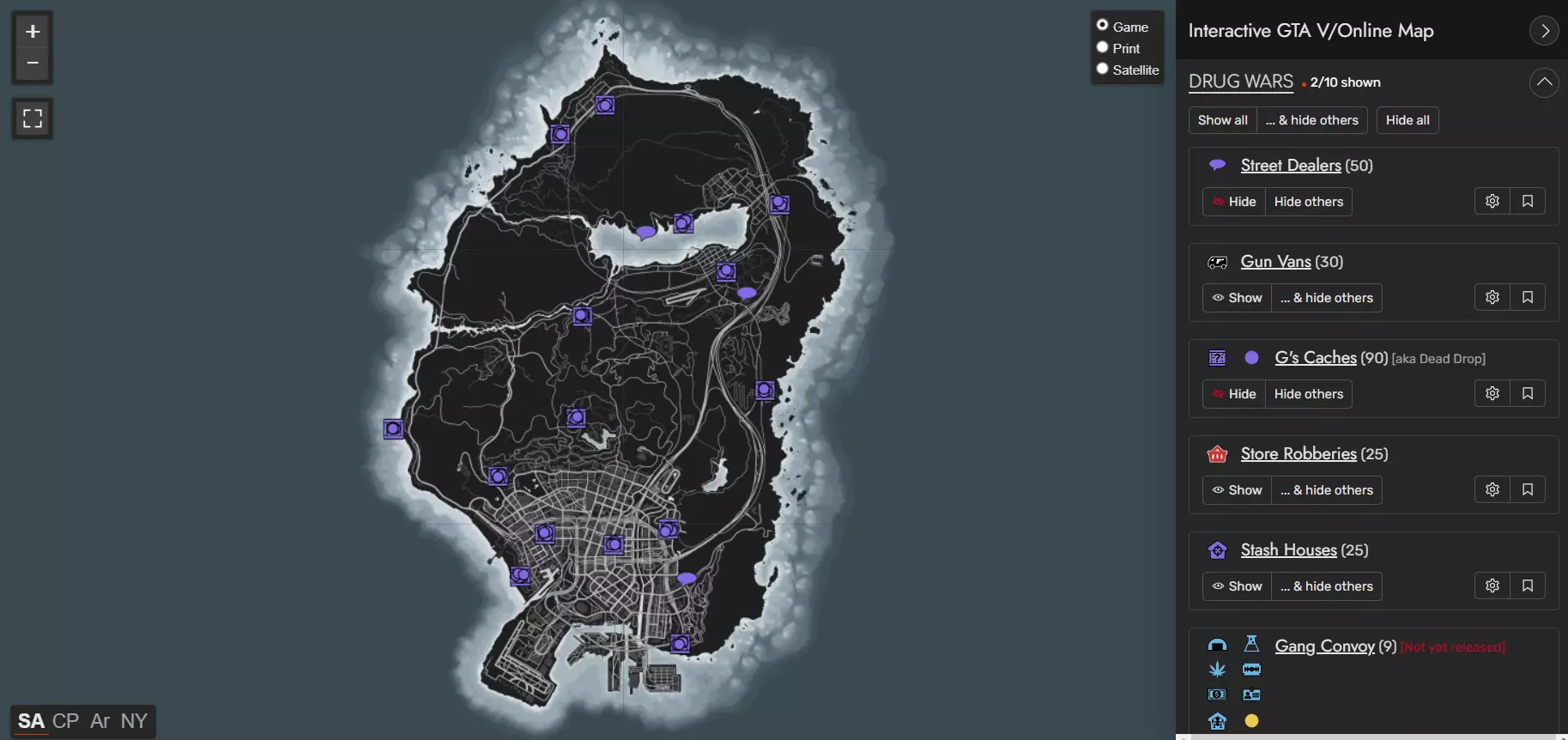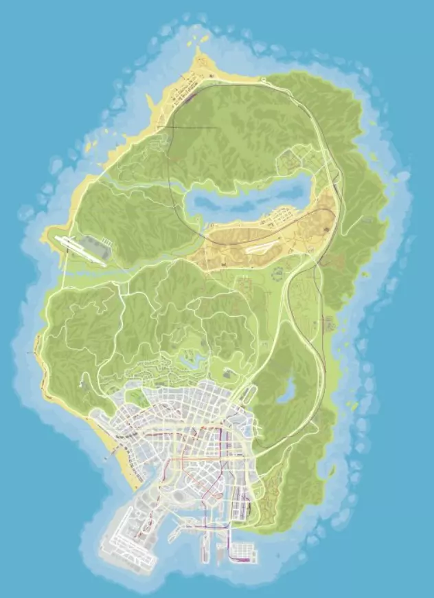 下面为你简要介绍《侠盗猎车手5》及线上模式的互动地图。这些地图包括圣安地列斯、佩里科岛、竞技场和北扬克顿,并且有两种显示形式,一种是游戏内的纸质地图风格,另一种是模拟卫星照片的样式。