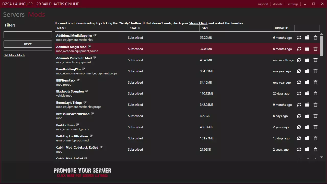 以下是各项功能的含义: 显示仅收藏服务器 - 只显示已收藏的服务器(通过服务器旁的星形图标选择)。 已游玩 - 只显示你之前通过DZSA游玩过的服务器。 无密码保护 - 只显示未设置密码保护的服务器。 仅显示模组服务器 - 只显示使用Steam创意工坊模组的服务器。 在线状态 - 只显示当前在线且未离线的服务器。 第一人称 - 只显示仅使用第一人称视角的服务器。 第三人称 - 只显示仅使用第三人称视角的服务器。 现在,你知道如何搜索服务器了! 第五部分 - 模组管理 DZSA的一个重要功能是管理模组,并确保你游戏内的模组正常运行。当你首次加入【模组服务器】时,通常会看到这样的提示信息: