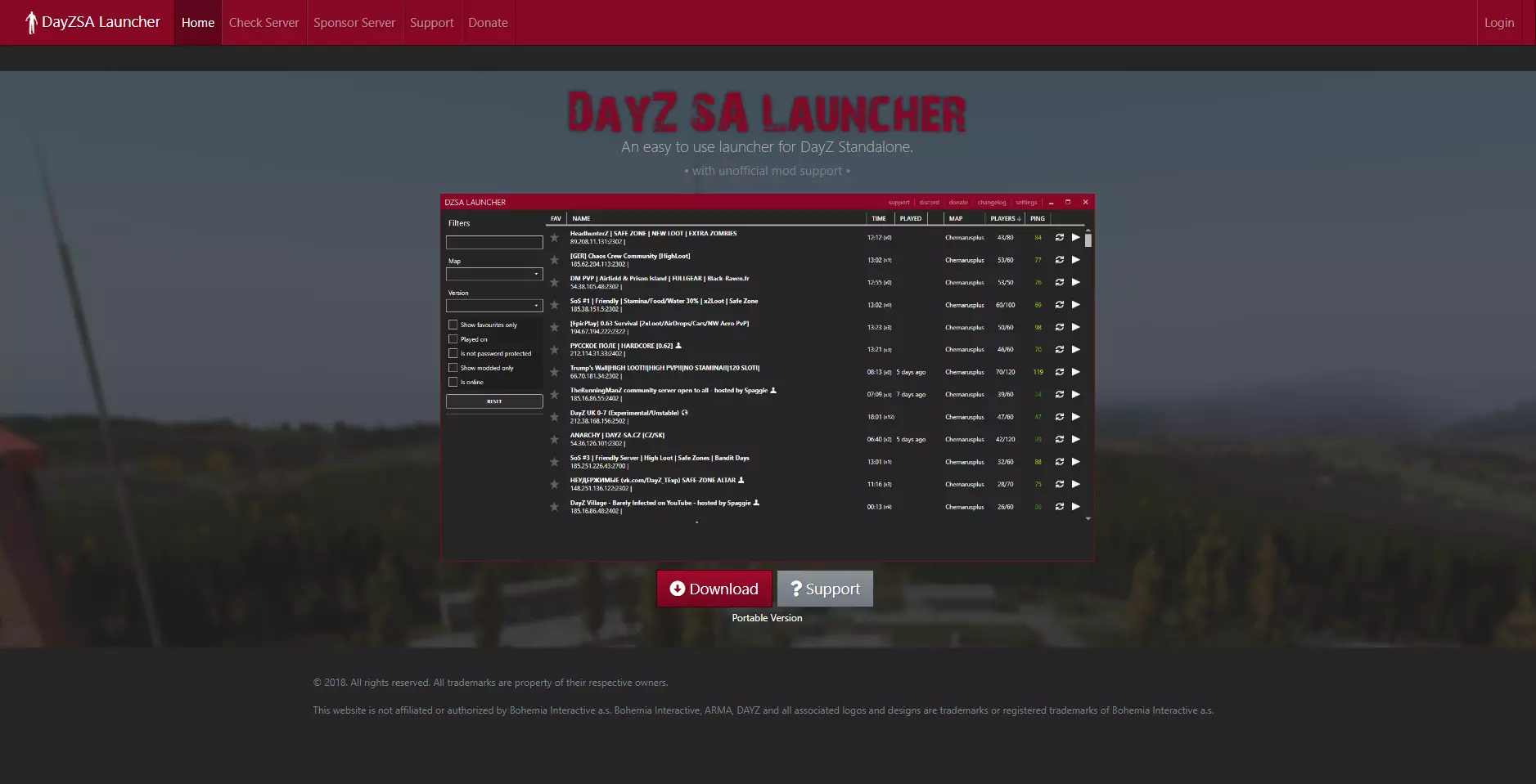 DayZ独立版启动器,通常简称为DZSA或DZSAL,是由Maca134为Bohemia Interactive的游戏《DayZ》开发的第三方启动器软件。该启动器被描述为“一款易于使用的DayZ独立版启动器,支持非官方模组”,是《DayZ》独立版游戏的主流第三方启动器之一。在此之前,Maca134曾开发过《武装突袭2》DayZ启动器(DZLauncher)和《武装突袭3》启动器(A3Launcher),其开发初衷都是打造一款易于使用、能让所有玩家受益的启动器。如果本指南未能直接帮助你解决具体问题,建议你通过相关渠道获取支持。所有这些信息也可在网站的支持部分找到。 本指南虽非官方指南,但提供了使用该应用程序的详细步骤,从下载初始安装程序到管理模组和加入服务器。 免责声明:本指南与Bohemia Interactive a.s.无关联,也未经其授权。Bohemia Interactive、ARMA、DAYZ 以及所有相关徽标和设计均为 Bohemia Interactive a.s 的商标或注册商标,且与 DayZ 独立启动器的创建者 Maca134 无关联。 第二部分 - 如何下载和安装 DZSA 要安装 DZSA,您首先需要满足以下基本条件: 您至少需要: - 从 Steam 或 Bohemia 在线商店合法购买并安装的《DayZ》独立版。 - 能够下载《DayZ》独立版游戏、游戏可能需要的模组以及任何互联网内容的网络连接(不限速度)。 - 一台能够以最低配置或更高配置运行《DayZ》独立版的电脑。一旦你拥有了这些,在你的设备上安装DZSA启动器就相当简单了。按照以下步骤进行安装。 步骤1 - 前往相关网站。 应该会显示如下页面。