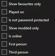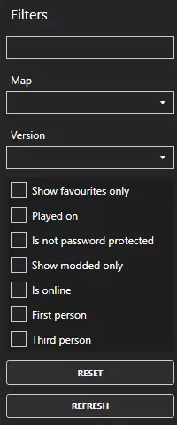 筛选器部分非常简单,但为了以防万一,我还是会逐一解释每个部分的含义! 第一个黑色空白框用于输入服务器名称。如果你知道服务器名称的确切拼写,或者服务器的关键词,比如“硬核”“纯净”或“玩家对战”,就可以通过这些名称中的关键词来筛选服务器。 地图框可以筛选服务器所使用的地图。这样你就能只显示特定地图的服务器,例如黑俄罗斯、利沃尼亚、纳玛斯克、塔吉斯坦等。 版本框可以选择服务器运行的《DayZ》特定版本。有些服务器可能没有运行最新版本(原因各异),但这个选项通常不常用,因为大多数服务器会尽快更新到最新版本。接下来的7个部分内容简单且简短,它们看起来是这样的: