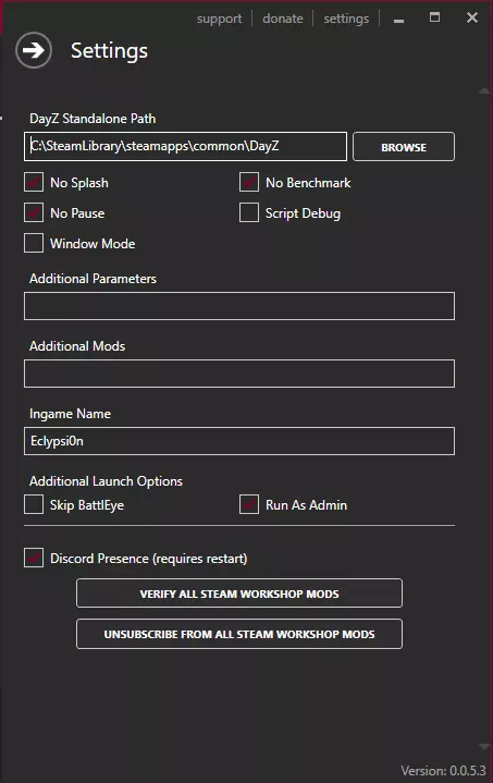 以下部分的功能也比较直观: Discord 状态显示 - 如果你使用 Discord,DZSA启动器可以在Discord上显示状态。这会向其他用户展示你正在运行启动器,以及你正在加入的特定服务器,方便他们加入你。如果你需要此功能,请勾选该选项并重启DZSA启动器以使设置生效。效果大致如下: