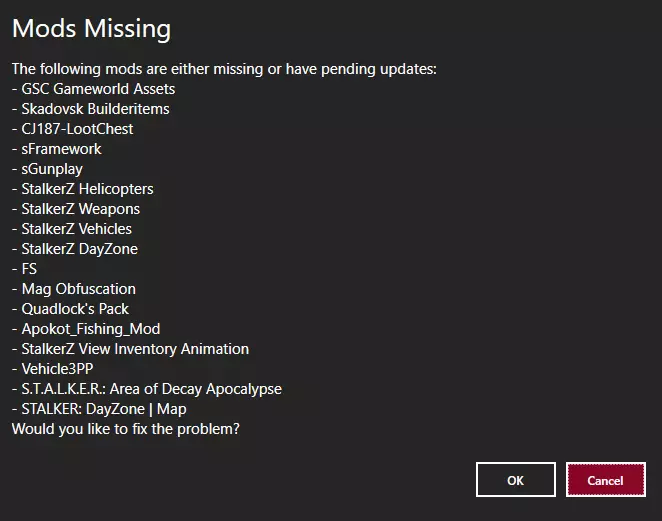 这条消息的意思是,我们缺少服务器运行所需的模组,必须安装这些模组才能加入服务器! 哦不! 但幸运的是,你正在使用DZSA启动器!你拥有快速、高效且安全获取模组的所有工具! 如你所见——上方图片的右下角有一个标有“确定”或“取消”的选项。 如果你点击“确定”,这将开始安装你缺少的所有服务器模组,这些模组将自动从Steam创意工坊开始下载,多方便啊! 要监控你的模组,你需要选择启动器左上角的【模组】部分。