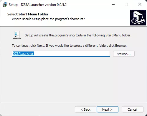 第四步 - 接下来会要求你选择一个开始菜单文件夹。你只需保留默认选项即可,通常为DZSALauncher。