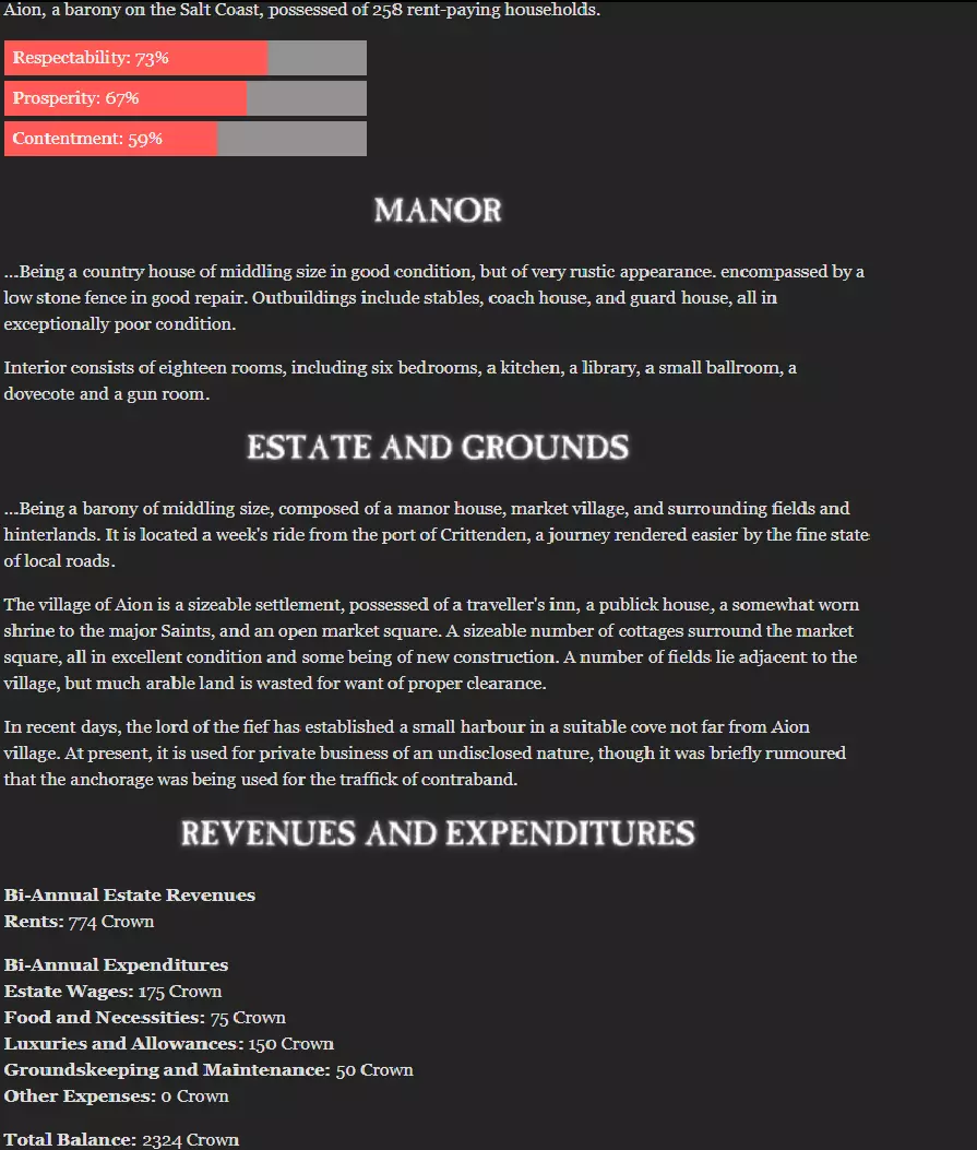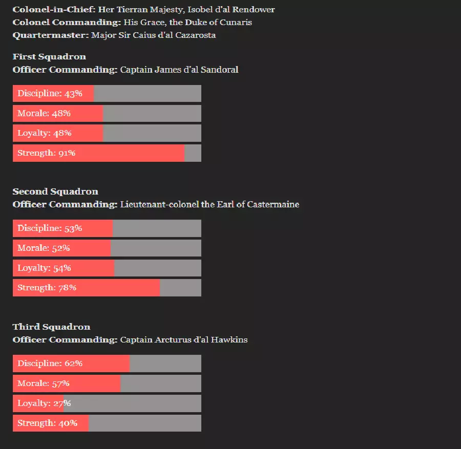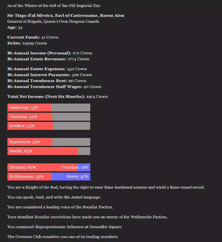 《无尽领主》盐海岸出身角色优化指南:从庄园到埃托利亚路线及锚地建设 非埃托利亚出身主角的最佳属性配置,同时最大化友谊和自主性属性。 简介: 本指南旨在记录我认为的第二优结局,即盐海岸保皇派锚地建设主角的最优配置。需使用以下指南中的存档: 军刀: 火枪: 序章: #伍尔弗拉姆错了;无论多么困难,我们都必须维持防御。 #必须回应伍尔弗拉姆的言论,我会回应它们。 若选择成为破坏者或加入伦道尔派: #“我很乐意接受您的邀请,大人。”“我认为这些新发明或许是新时代进步的先驱。” “我们难道就找不到既能维持军队又能结束战争税的办法吗?” “遗憾的是,我已另有承诺。” “我必须同意,更多的纪律对他有好处。” 若选择前往海外: “抱歉,大人,今晚我已有约。” 我应该和帕利泽谈谈。 我得弄清楚塔卡兰大使究竟在这里做什么。 “坦白说,我自己也觉得这种新风格相当乏味。” 帕利泽的情感是高尚的,我相信他的意图是好的。 第一章: ……最终,谈判无果而终。 我会努力激励他们,让他们相信我们注定会成就更伟大的事业。 ……会谈毫无结果。没有达成任何约定。#我会看看首都有哪些朋友愿意帮助我。 #我应该寄些钱回家,帮助改善我的封地。 1000 #或许我应该考虑加入伦道尔俱乐部。 #我必须想办法加入伦道尔。或许可以直接向伍尔弗拉姆公爵求助…… 如果是破坏者: #我确实觉得与其帮助伍尔弗拉姆,不如阻碍他。 如果不是破坏者: 这项条约符合我们的最大利益。” #支持基安条约是我的职责。 第六章: 如果是破坏者: #“如果我在伍尔弗拉姆派系中保留现有职位……这符合我们的共同利益。” 如果不是破坏者: #“殿下,我支持王室。” #我打算处理我家族的债务问题。若为破坏者: #我需要一大笔钱;至少5000克朗。 #我应该寄些钱回家,帮助改善我的封地。 500 #是的,我想我会进行捐赠。 50 若为破坏者: #去他的这些。我还是去俱乐部吧。 若不是: #他们别想把我赶出议会! #不,我会动用我所有的权力去追查反对派。 第七章: #“我很好,先生——非常高兴能再次在您的指挥下。” #首先,士兵必须有纪律! #绝不妥协:这个委员会不能为了政治权宜而束缚自己。 #“公爵大人,您似乎对此非常确定。” #“公爵大人,我打算维持和平,无论在什么情况下。” 第八章: #我们应该保持距离进行观察,除非必要,否则不采取更多行动。 #“我无法为自己的行为道歉。我只是做了我认为正确的事。” #我打算处理我家族的债务问题。 如果存在破坏者: #我需要一大笔钱;至少5000克朗。 如果不存在破坏者且完成了3b: #我希望偿还部分家族债务。 1500 #我打算处理我家族的债务问题。 #我必须尝试重新协商贷款利息。 如果不存在破坏者且完成了3c: #我打算处理我家族的债务问题。 #我必须尝试重新协商贷款利息。 #我应该寄些钱回家,帮助改善我的封地。 500 #“按部队分头行动,搜寻袭击者,但是,啊——注意不要太执着。” #第一中队是所有人里最薄弱的,我会去那里帮忙。#每个事件都必须单独评判,不受政治环境或效忠对象的影响。 第九章: “天啊,凯厄斯爵士。很高兴再次见到您。” 若与卡塔琳娜发展浪漫关系: 恰恰相反,正是她对职责的忠诚吸引了我,还有其他方面。 若为破坏者或完成了3c: “大约二十人就足够满足我的需求了。第一中队可以带走剩下的人。” 我的指挥部将承担最艰巨的任务,这样第一中队就不必如此了。 其他情况: “第二中队急需增援;恢复其兵力应当是首要任务。” 若为破坏者: 我打算处理我家族的债务问题。 我需要一大笔钱;至少5000克朗。 若不是破坏者且完成了3b: 我打算处理我家族的债务问题。#我必须尝试重新协商贷款的利息。 #我应该寄些钱回家,帮助改善我的封地。 1000 若为破坏者: #“考虑到我目前与乌尔弗拉姆公爵的关系,我几乎别无选择。” #“我只是凭良心行事而已,公爵大人。” #我会同意乌尔弗拉姆的要求,但只为从内部破坏他的计划。 若不是: #“我是女王忠诚的军官。我不会与她的敌人同流合污。” #“我认为这不值得冒险。” 若为破坏者: #我必须努力恢复自己的身心健康。 #这些年来,我的领导和鼓舞能力有所减退;我必须重新磨练。 若不是: #我或许仍能利用俱乐部的人脉来巩固自己的地位。 #我打算利用自己在改革派中的地位来推进派系的目标。#若要依靠这些人,我必须确保他们对我忠心耿耿。 #没有什么比金钱更能确保士兵的忠诚了。 若存在破坏者: #给每个士兵发三个月的军饷,他们定会非常高兴。 若不存在破坏者: #士兵们若能得到两个月军饷的奖金,反应肯定会很好。 #我亲自负责团里的训练,为即将到来的战斗做准备。 #第一中队最需要训练,应当优先安排。 #我亲自负责团里的训练,为即将到来的战斗做准备。 #第二中队是我的直属部队,因此理应优先训练。 第十章: #桑多尔上尉将指挥第一中队。 若存在破坏者: #我必须为乌尔弗拉姆意识到我是他的敌人那一天做准备:成为禁卫团的典范。若否: #化身王室卫队。若保皇党需要,我时刻准备着。 若不是破坏者: #“伟大的基安会帮助我们吗?” #“考虑到目前情况,这应该是最明智的决定。” #“我们应当等待时机,先看看乌尔弗拉姆的动向。” 若是破坏者: #我应该听从加勒特的“建议”,查明我家族债务的存放之处。 #“如果