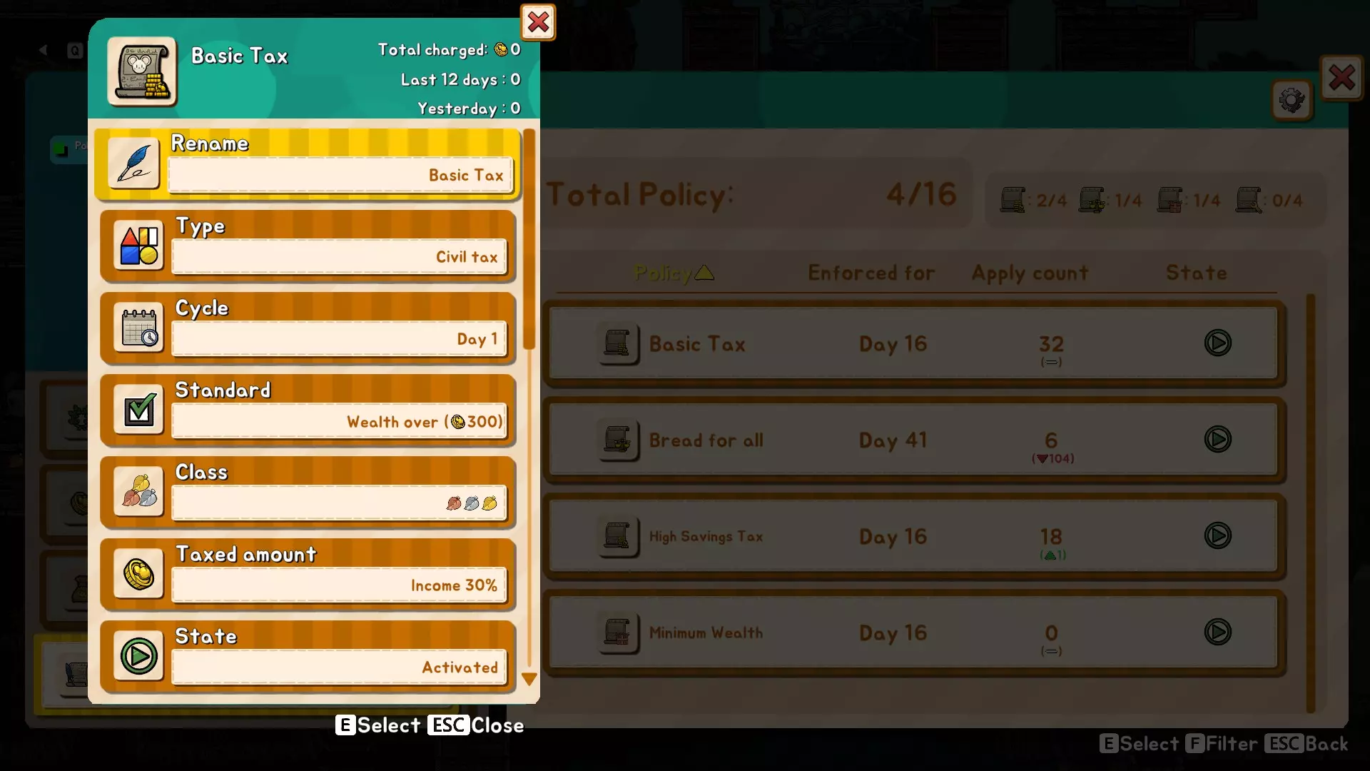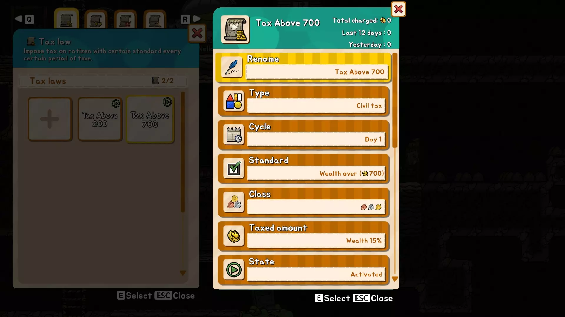 本指南将探讨游戏中设置税收的基础知识。我于2024年3月31日开启了新游戏,因为游戏推出了新内容。我选择了简单难度,这样就能专注探索中后期游戏内容,而不必一直应对入侵。 需要注意的是,如果法典石被瘟疫鼠禁用,你必须重新启用税收功能。 前期游戏 设置税收的简单方法如下: 前期游戏 游戏初期的首个税收设置是基础税率。考虑到初期资金有限,此时的税收阈值设为200。为了让鼠民晋升到下一个等级,需要500财富值以及满足生活必需品。一旦你拥有足够财富来支持更高等级的鼠民,这项基础税收将在之后调整为约600。