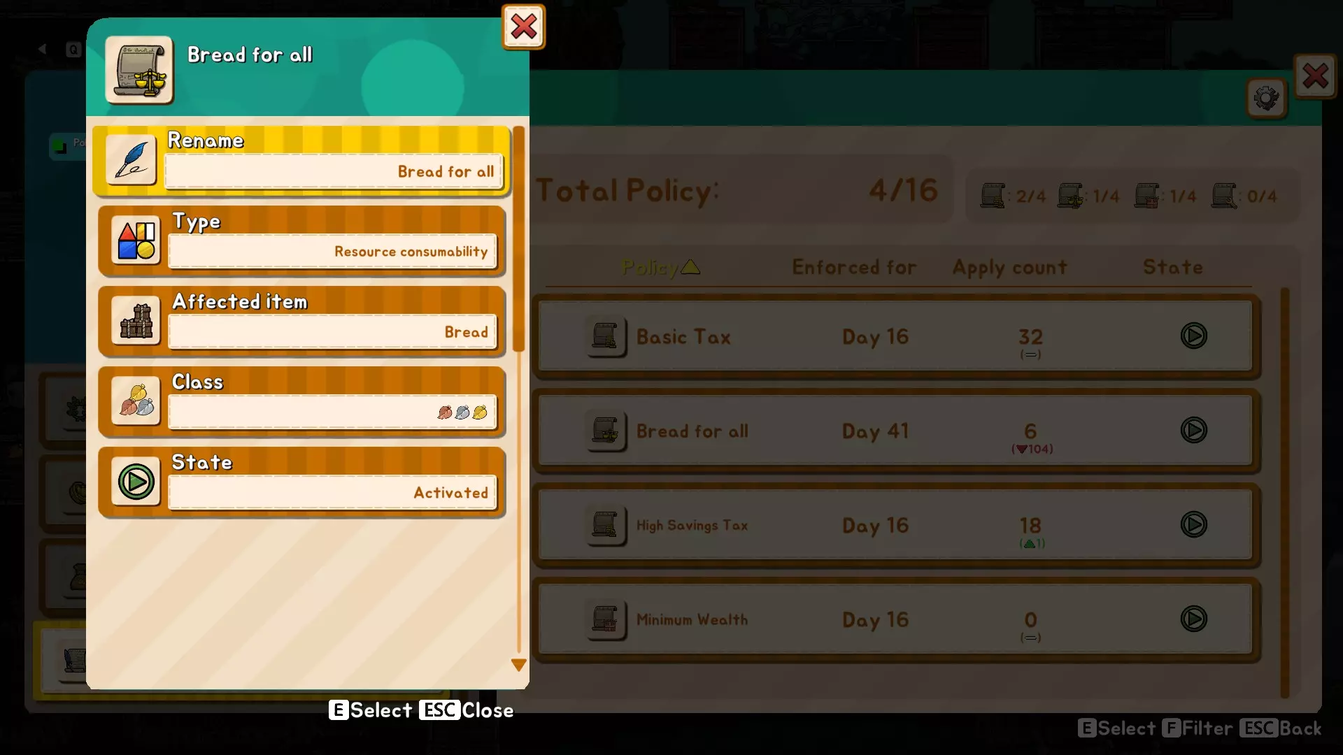 我一开始将最低阈值设为100,因为初期他们没有太多必需品需要购买,但到了后期,当你开始培养富裕的鼠民时,可以考虑将其提高到200-300。显然,这些数值的利润空间很小,你偶尔会遇到鼠民乞讨钱财或食物的情况。我们之后会修复这个问题。 为了准备交易,我们需要开始制作面包。必须确保有足够的谷物和水。面包是比谷物更好、更高效的食物来源,所以在游戏初期升级到面包是个不错的选择。别忘了通过制定政策,允许你的鼠民食用面包。