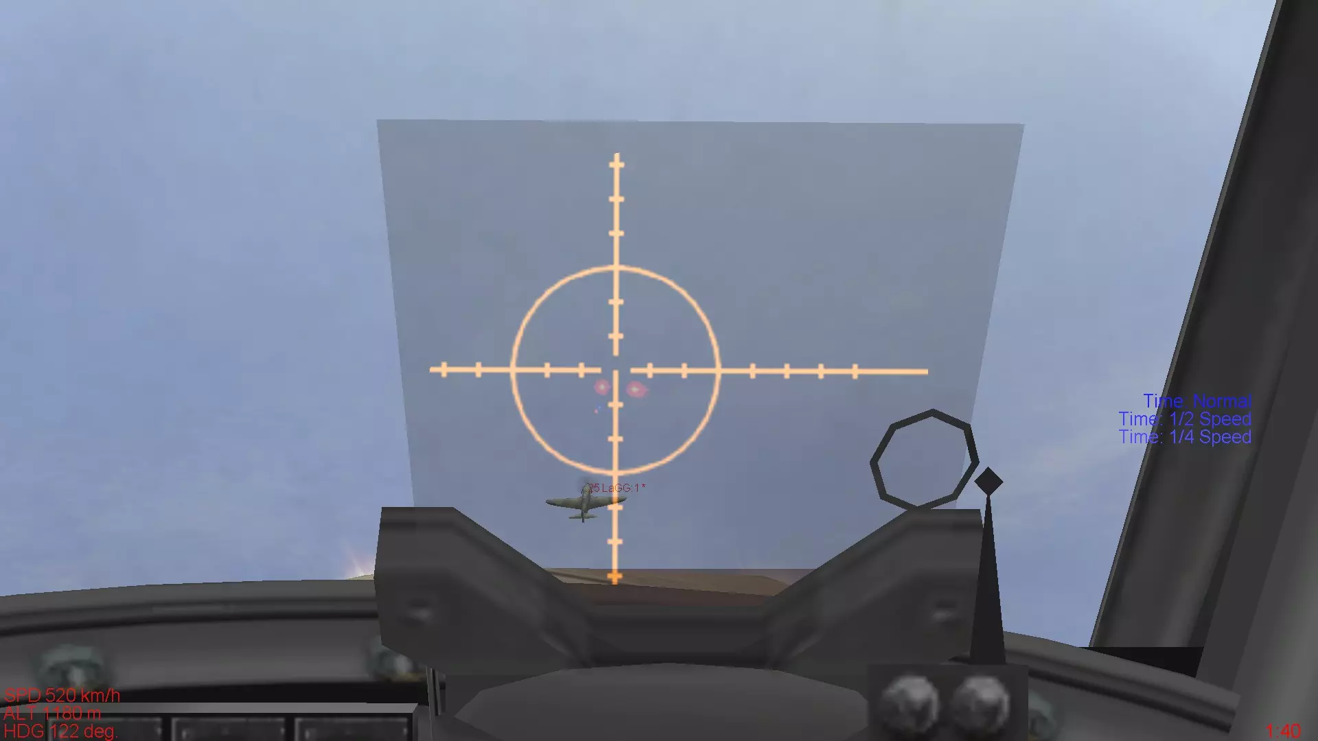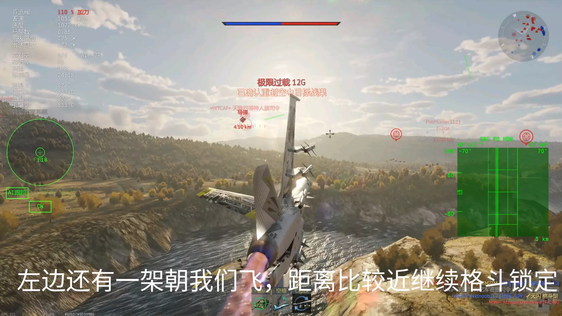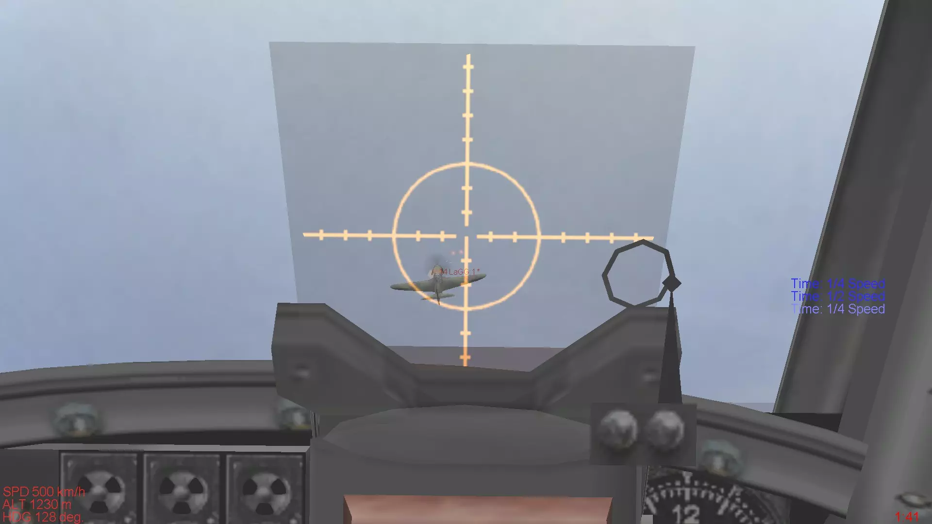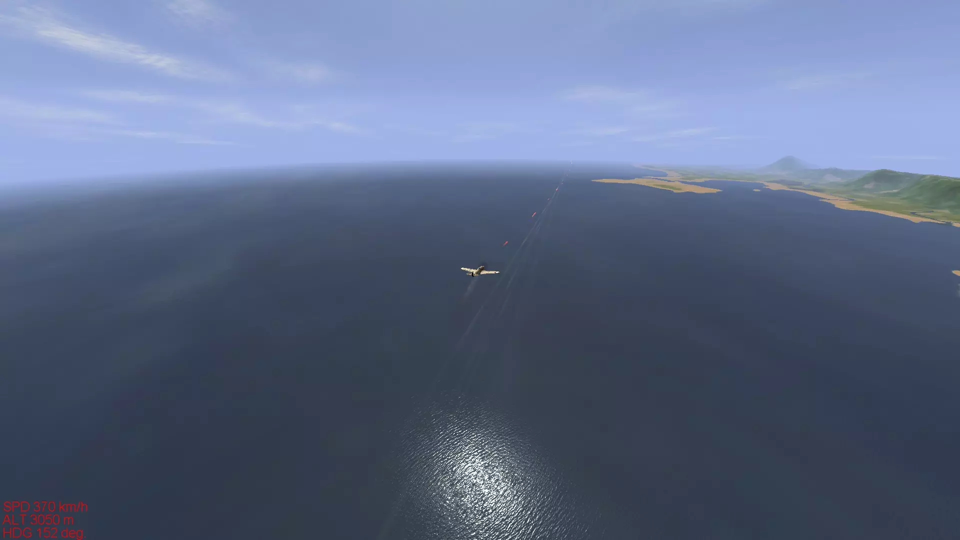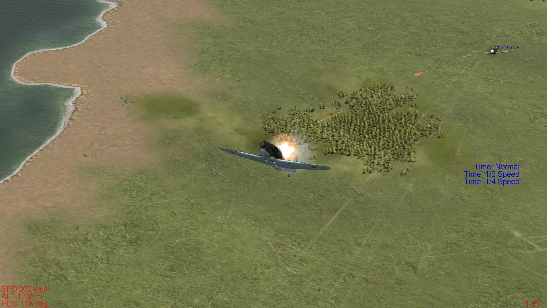 将收敛距离设为400米,并在接近至30米左右的状态下,将敌人捕捉在瞄准器正中央进行射击时的情况。可以确认发射的机枪弹道与瞄准点有较大偏差。 射击要点 在此想介绍笔者在射击时确定的4个规则: 1. 射击姿势应在接近敌机1公里以内完成。 2. 若处于敌机正后方,要尽可能接近。进行提前量射击时,若无法确保在不损失速度的情况下命中,就不要强行射击。 3. 射击时间控制在1 - 2秒以内。 4. 总之不要急躁。能进行射击时,自身的优势就已确定。- 射击姿势应在接近敌机1公里以内完成。所谓基本射击姿势,关键在于如何稳定自身机体进行射击。飞机不会立刻按照你的想法行动,射击前如何快速调整好射击姿势至关重要。在自己和对方机体都以每小时300公里以上速度在空中飞行的情况下,等到想“好,射击”时再去判断如何稳定机体就为时已晚。 - 若处于敌机正后方,应尽可能接近。按照上述解说中的③射击方法操作后,我便使用②的方法进行击落。 交错而过时,要先确认敌机的机头完全不在我方这边,然后瞬间估算出偏差距离,稍微移动瞄准器后立即开火,相信大家能明白这一点。 之后,由于敌机的动作变得迟缓(恐怕是第一发子弹就击伤了飞行员),我便从后方紧追不舍,采用②的方法将其击落。 下面,我们结合图片来解说上述视频。进行提前量射击时,如果无法确保在不失速的情况下命中目标,就不要强行射击。 咬住敌机正后方是射击的理想状态。正如上一节视频中所示,要做到弹无虚发,不给敌人规避的手段和时间。 关于提前量射击,下一节会进行讲解。但需要注意的是,会导致自身飞行速度(能量)大幅损失的射击,从射击后的战术机动角度来看并不可取。无论是提前量射击还是从后方射击,都要时刻力求在有十足把握命中时再开火。 - 射击时间应控制在1~2秒以内。正如前一部分所述,胡乱扫射不仅是为了降低因曳光弹被发现而遭追击的风险,而且当你对射击有一定熟悉度后就会发现,在近距离射击时,射击窗口通常只有1-2秒左右。 这意味着如果射击时间过长,要么是瞄准不到位,要么就是距离太远。(不过像仅装备小口径机枪的机型等,有时也需要较长的射击时间。) 总之不要慌张。能进行射击时,你的优势就已经确立了。对于那些不习惯击落敌机或主要进行格斗战的人来说,最常见的问题就是急于开火。空战中,急躁是大忌。首先要明白自己必须处于能够射击的绝对优势位置,然后抑制住冲动,冷静操作。笔者在刚接触射击、容易急躁时,会在进入攻击姿态后深呼吸,射击时保持平稳呼气,以此来控制自己不急躁。在现实中,还有其他各种方法来控制自己,比如通过观察机内时钟秒针的移动,让自己冷静到能够准确读取具体时间。你也可以摸索适合自己的方法。 下次将制作空战中常用的【前置射击】(偏差射击)的解说章节。 【前置射击】 在之前的章节中,我们讲解了从正后方进行射击的基本方法。然而,在实际空战中,几乎不存在直线飞行的敌人,多数敌机都会进行急转弯或爬升,很难按照预想的方式移动。 这时就需要用到偏差射击(也称为提前量射击)技术。 偏差射击有几种类型,大致可分为3种: ①近距离射击时几乎无需进行偏差调整的偏差射击。 ②从300米左右的距离开始持续射击,同时在接近过程中不断调整瞄准以持续命中的偏差射击。③在与敌机交错或未将其纳入瞄准器的情况下,预判敌机的机动,从敌机后方、后上方或后下方以外的方向进行短点射的偏差射击。 理想的偏差射击是从近距离瞄准敌机前方约10米左右,偏差较小,能在短时间内造成大量伤害,因此应以此为目标。 笔者擅长的是第二种方法,即从稍远的距离开始射击并持续命中,但这种方法在不熟练时很难命中,属于较难的射击方式。 第三种是最难的偏差射击,感觉上接近飞碟射击,是难度极高的射击技术。这是历史上的王牌飞行员汉斯·约阿希姆·马尔塞尤常用的射击方法。从理论上来说,偏差射击时子弹的初速大多在800米/秒左右,要命中以至少数十米/秒速度飞行的敌机,就需要将子弹射向目标在子弹飞行时间内移动的距离前方。例如,距离100米时子弹飞行时间为0.125秒,若敌机速度为360千米/小时,那么在这段时间内敌机将移动12.5米,所以子弹需要射向敌机前方12.5米处。此外,自身飞机速度的变化会改变偏差距离,所承受的过载也会导致子弹弹道下降,因此偏差射击的偏差距离时刻都在极短时间内变化,根本没有时间逐一计算。可以说,需要具备瞬间判断曳光弹是朝着敌机后方还是前方飞行的动态视力,这些曳光弹总是以瞄准器为基准发射的。 偏差射击与其说是理论问题,不如说更多是感觉上的问题,因此很难解释清楚。不过这很大程度上取决于练习量以及个人原本就具备的动态视力好坏,所以还是要专心进行射击练习,努力做到能看清弹道轨迹。 我本身运动神经就不太好,动态视力也不算优秀,所以每天都会花不少于两小时的时间与AI敌机进行偏差射击练习。 偏差射击的方法 首先来看一下这个视频。