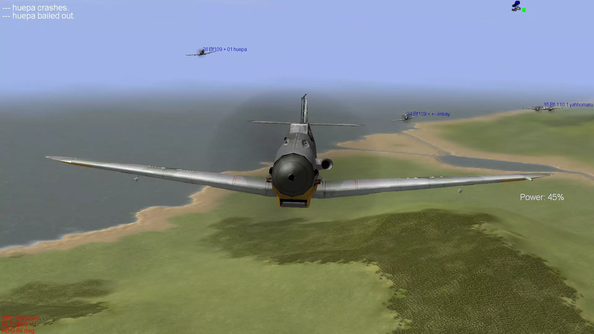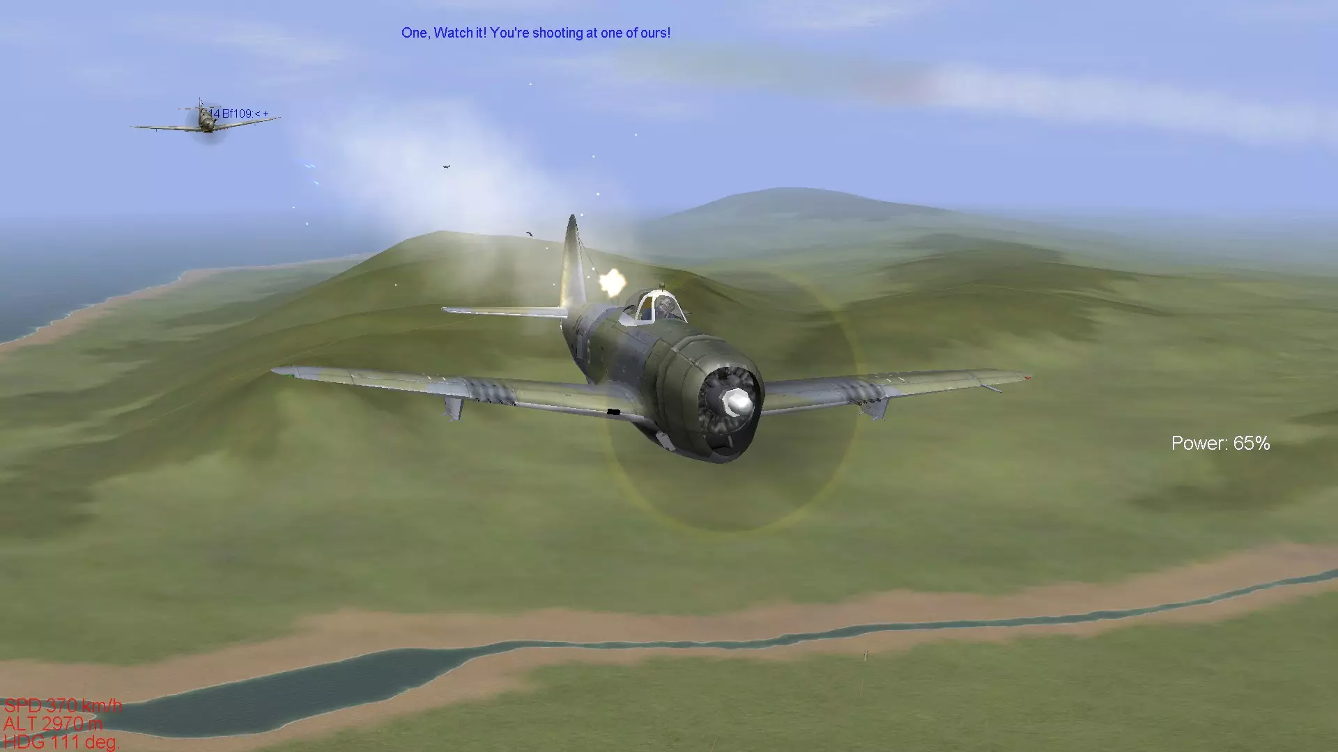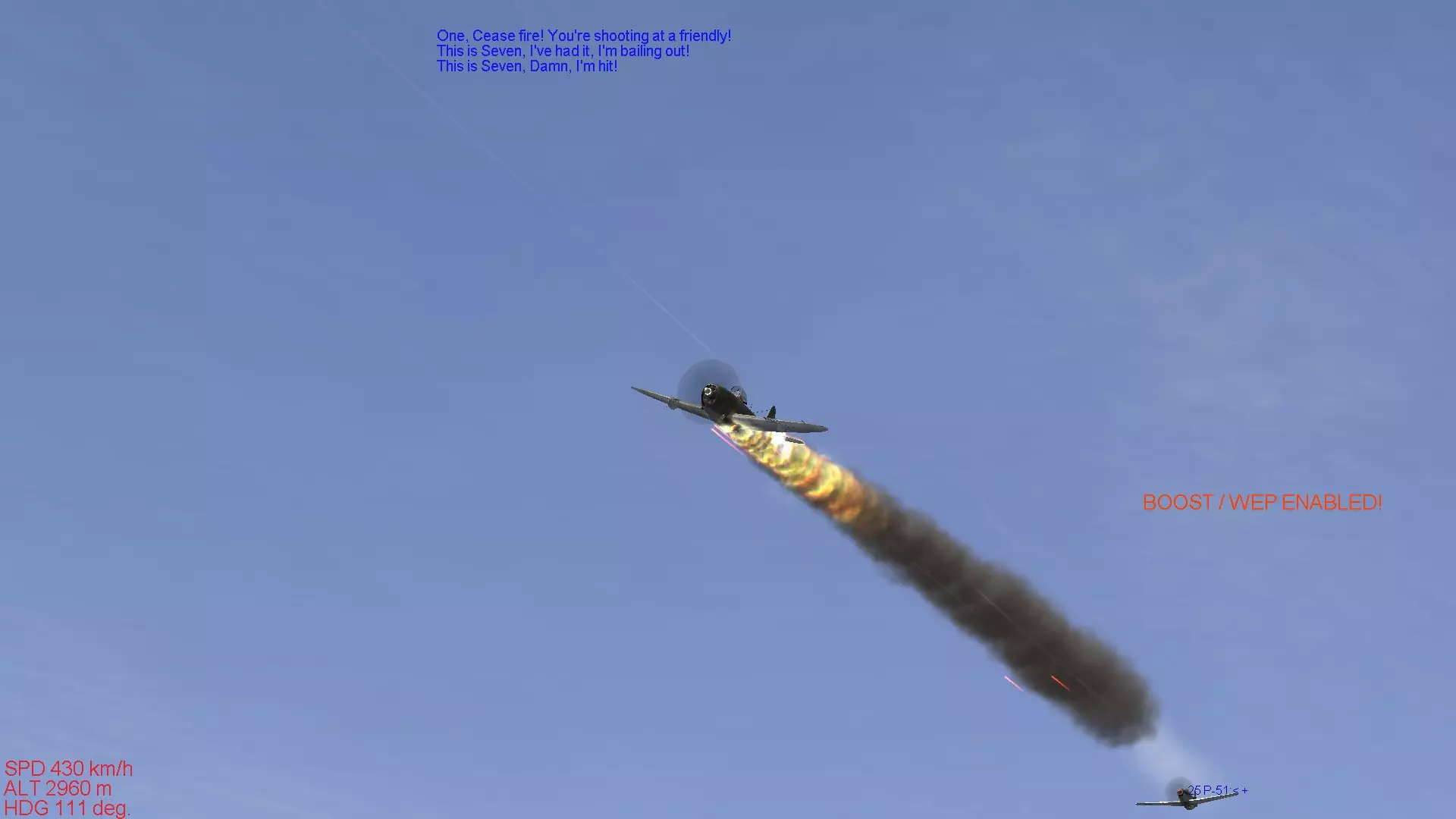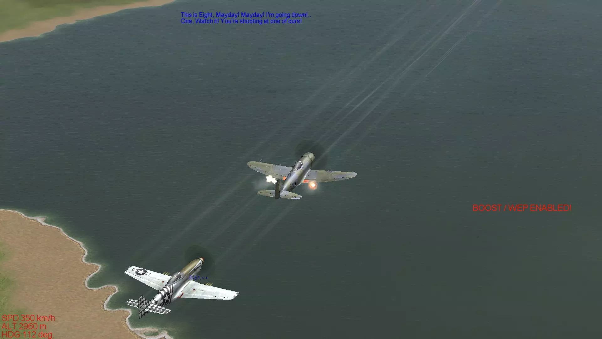 这是英国皇家空军(RAF)引以为傲的独一无二的战斗机。虽然不能推荐给新手驾驶,但它既不像零式战斗机那样面向老手,也不像La系列那样极端强大,因此我认为比驾驶那些机型要好得多。飞行特性与零式战斗机比较接近,武器装备也属于标准配置。不过,当提高发动机输出时,机体总是有上升的趋势,即使在转弯时机头也容易比预期抬得更高,操控上有一些小毛病。在进行仪表飞行的同时控制机体姿态进行飞行相当困难,Mk.在IX型以前的型号中,存在负过载时发动机会出现“呛油”的问题,如果持续施加负过载,最坏情况下会导致发动机熄火,因此不太适合新手。 方位磁罗盘由于游戏本身的设计,位于非常难以看清的位置,所以在使用全真模拟设置飞行或进行仪表飞行时,需要特别注意这一点,操作起来会比较费力。 另外,其中Mk.IX的25磅系列机型拥有与La-7相当的性能,但如果一直驾驶该机型,容易像长期驾驶La-7一样,过度依赖机体性能,这一点也需要留意。喷火战斗机需要你理解它的特性并进行精准操控,才能发挥出出色的格斗性能,所以要熟练驾驭它需要相当的耐心,但喜欢英军战机的玩家不妨努力训练,力求熟练掌握喷火战斗机。 它的起降性能和Bf109一样,起落架比较脆弱,因此需要进行稳定的起降操作。 舰载机型海喷火的着舰难度在IL-2系列游戏的着舰操作中属于顶级,想要提升着舰技术的玩家可以尝试一下。虽然上述机型不推荐给新手,但这仅仅是我个人的建议。如果你真心喜欢这些机型,并且有决心通过练习来熟练掌握它们,那么完全可以选择驾驶。最重要的是保持动力,与其在不喜欢的机型上反复练习,不如用自己喜爱的机型尽情练习,这样对心理健康更有益。我个人非常喜欢Bf109,一直用Bf109进行练习。当遇到瓶颈时,我会反思自己的不足之处,重新阅读推荐机型和不推荐机型的介绍,希望这能成为大家提升技术的方法。 那么,关于机型介绍的部分就到此结束了。 从下一部分开始,我们将进入真正的空战技术相关内容。 首先会介绍空战所需的技术,包括编队飞行的重要性,以及使用机枪进行射击的技巧。编队飞行的基本 一提到螺旋桨战斗机的空战,大家首先想到的可能就是紧紧跟在敌机后方进行射击的画面。 实际上,要跟在敌机后方是非常困难的,必须综合判断自身与对方的速度差异、双方的转弯性能差距,以及射击角度是否合适等。 而编队飞行中的速度控制和姿态保持,正是实现对敌机尾追的基础。虽然长机和僚机的职责要求略有不同,但本节内容并非讲解作为长机时的编队飞行方法,而是以2至4号机的视角,介绍如何将自身战机引导至敌机后方所需掌握的技术。因此,阅读本解说时,请将自己置于跟随长机的僚机立场。 当然,当你作为长机飞行时,也需要注意速度控制和姿态保持,以确保僚机能够稳定跟随。本节将介绍编队飞行的基本内容,掌握这些内容对提升上述提到的操控技术,以及后续章节中介绍的空战战术都有重要影响。不过这只是其中的一小部分,后续章节还会介绍许多以编队空战为前提的内容,所以请务必牢记。 在现实中,编队飞行是空战的基础中的基础,当然在游戏《伊尔2:1946》中,编队飞行也能带来诸多好处,让我们认真学习吧。