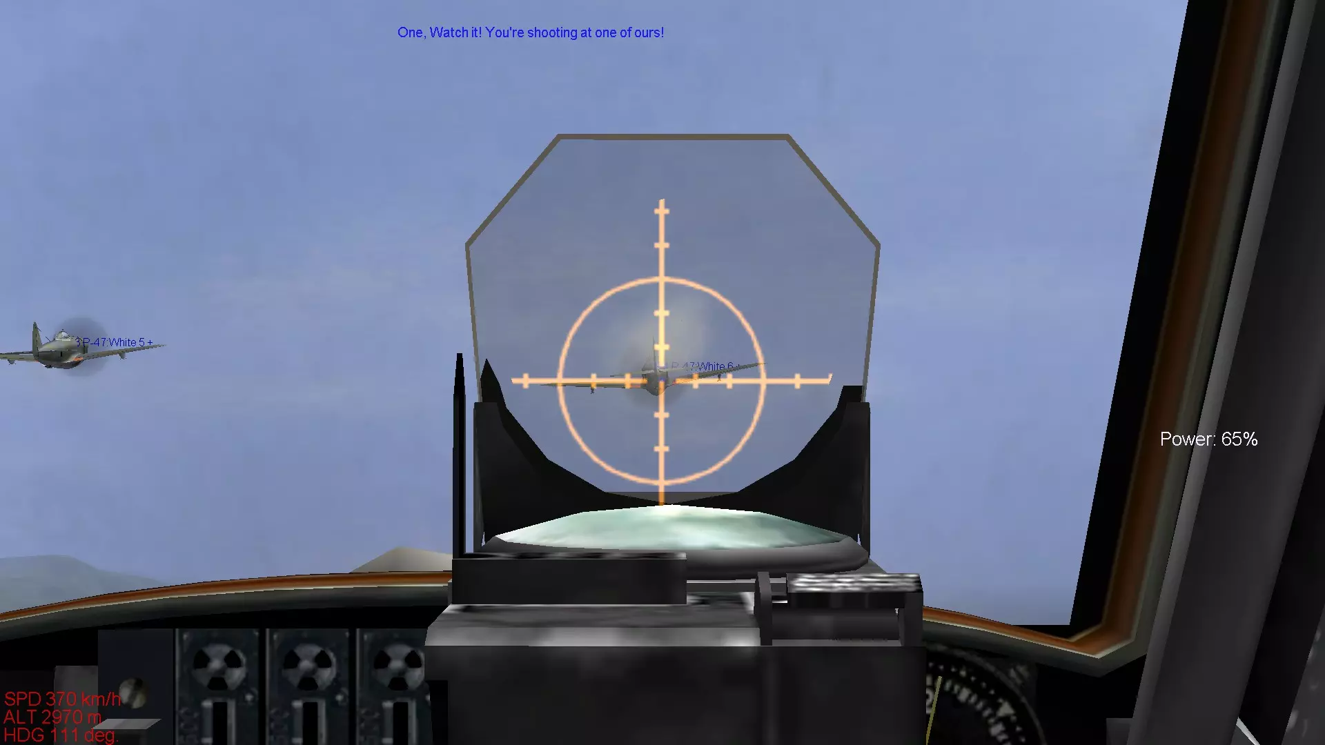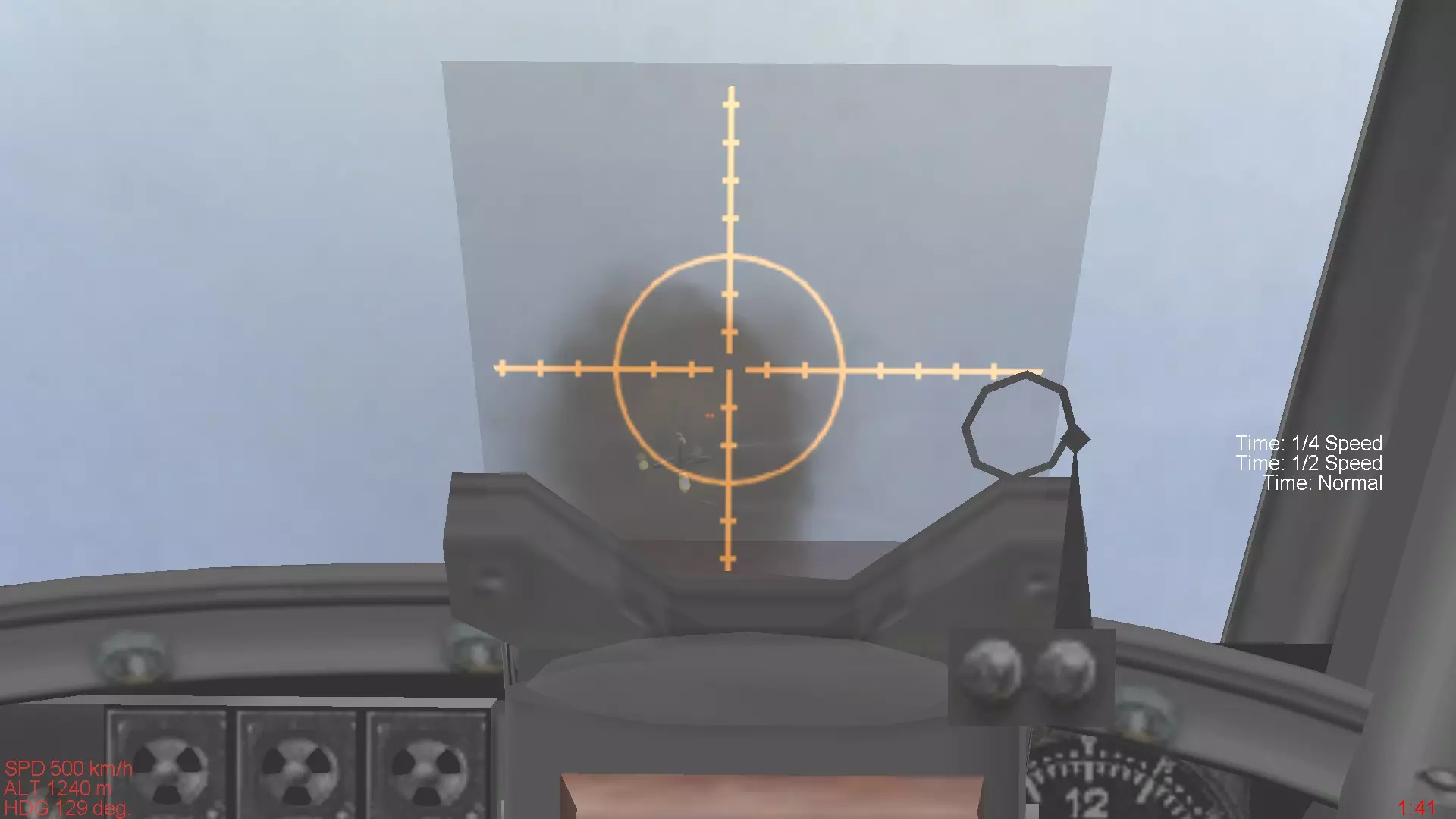 在这段视频中,一开始是组队飞行。首先要将机体调整到左右任意一侧,同时要尽量保持与长机(队长机)的稳定,与长机保持平行且一定的距离飞行。要想整齐排列机体并保持稳定,一个简单的方法是使用战斗机上配备的瞄准器,就像下图所示。除此之外,根据不同的机体,还可以利用座舱盖的边缘或座舱盖边缘上的螺栓位置等进行参考,来稳定排列机体。