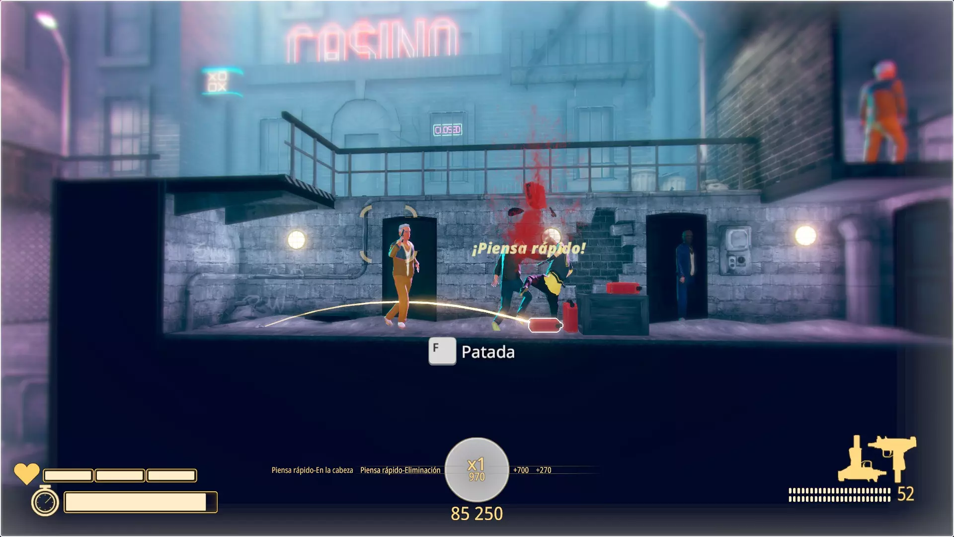 快速思考 一脚将煤气罐踢向敌人面部。你可能需要多次尝试。敌人必须死于被脚踢出去的煤气罐。务必小心不要射击煤气罐,也不要让敌人射击煤气罐,你必须迅速行动。我推荐【旧城区】章节的第6关。敌人身上会弹出【¡piensa rápido!】提示信息。