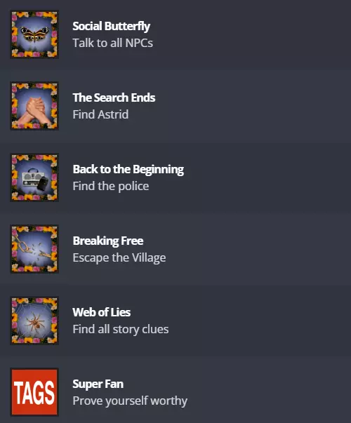 直面真相 完成游戏。你需要以任意评分完成章节中的唯一关卡。 累积型成就 可通过长时间游玩及多局游戏累积获得的成就。