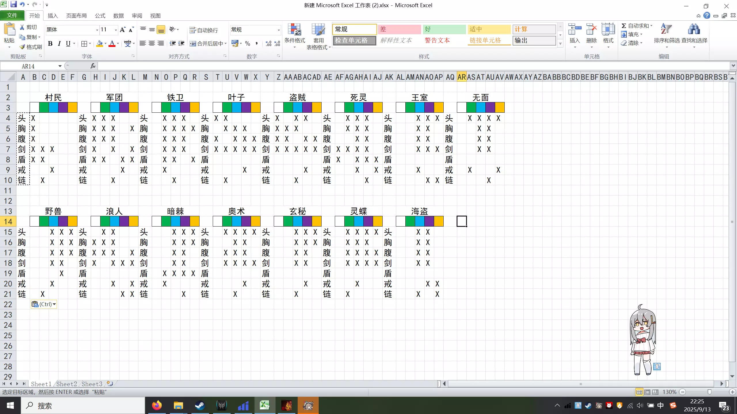 这是一份中文版简易图鉴,以Excel表格形式呈现,涵盖村民、军团、铁卫等多类别的头、胸、腹等部位及剑、盾等装备的对应信息,是实用的游戏类装备部位图鉴。