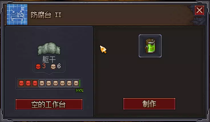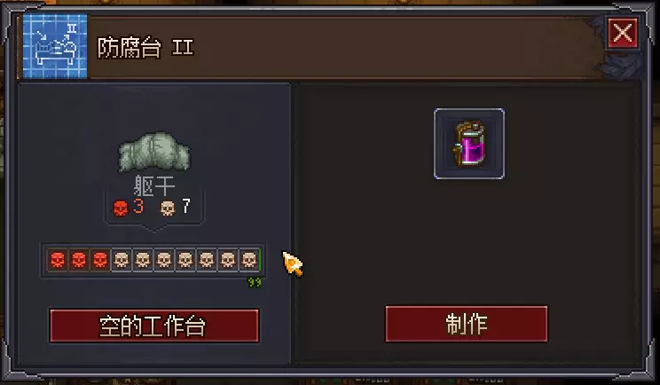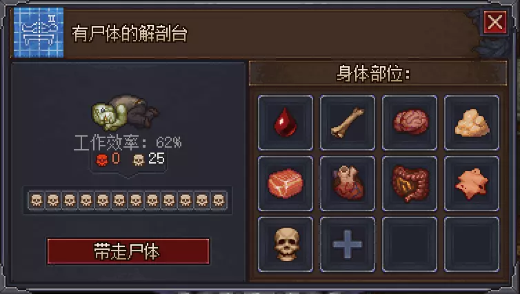 那么我们通过原有的注射防腐剂的方法先制作出十二【白】尸体,然后再在工作台处将所有器官修改为+3【白】,然后装回到尸体里,我们就能得到一具二十五【白】尸体,复活为僵尸后工作效率可以达到62%。