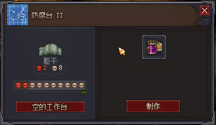 红骷髅头,代表尸体中残留的罪孽(在后文中用【红】表示); 白骷髅头,代表尸体中残留的美德(在后文中用【白】表示); 绿骷髅头,代表尸体的腐败程度(在后文中用【绿】表示)。请注意,未埋葬的尸体会随着时间的推移渐渐腐烂。尸体置于地面的时候腐烂程度会加快,而尸体置于户外地面的腐败速度最快,移至太平间后可降低腐烂速度,后期冷冻托盘与防腐药剂可以减缓尸体腐烂速度。 当尸体新鲜程度低于90%时,尸体的【白】就将转化为【绿】。新鲜度达到0%后,所有现有和潜在的【白】都会转化为【绿】。所以当驴子送来尸体后(会有响铃音效),我们想要得到新鲜的尸体就应该尽快去处理尸体。同时在修理好进尸口与出尸口后,驴子会将尸体直接丢进太平间内,建议尽早修理。 2.为什么要提高尸体质量 在游戏中,我们作为守墓人,目标之一就是提升我们墓地的美观度(如图中绿色花环骷髅头代表的就是墓园的美观度),而尸体的质量好坏会影响我们埋葬尸体后墓地美观度的高低。那么如何提升墓地美观度呢?