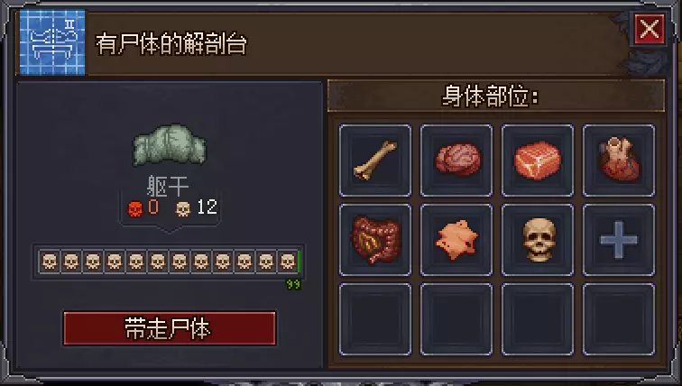 所以,我们的目标就是尽可能的削减【红】与【绿】,增加【白】,从而为墓园增加最大程度的美观度。 三.高质量尸体制作 1.十二【白】尸体制作(无灵魂保存DLC) 在明白尸体存在【红】与【白】属性后,我们可以进一步了解到,尸体的【红】【白】属性其实是由器官带来的。一具尸体内共有9个器官,其中血液、骨头、肉体、脂肪和骷髅头的【红】【白】值是固定的,具体如下: 血液:+1【红】-1【白】 骨头:0【红】0【白】 肉体:+1【白】 脂肪:+1【红】-1【白】 骷髅头:-1【红】 可以看出,这5种器官的【红】【白】值总和为0,所以一具尸体的【红】【白】属性完全由心脏、肝脏与大脑携带的【红】【白】值所决定。而心脏、肠脏与大脑的【善】【恶】值是随机的(后期深色心脏、深色肠脏与深色大脑的数值固定为+4【红】+1【白】)。同样在后期,我们解锁解剖与炼金学中的信徒后,就可以看见器官附带的【红】【白】值了。