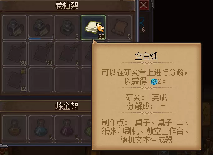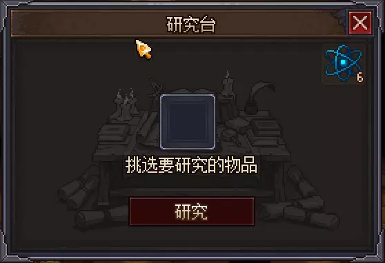 研究物品时需要用到信仰与研究点数,其中信仰通过教堂布教获得,科技点数通过从研究台分解空白纸和书获得。