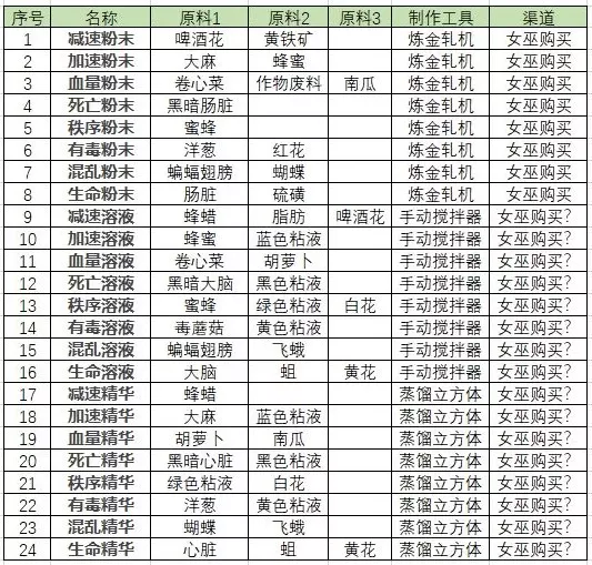 二、炼金药水的制作以及配方 拥有原材料和配方后,我们就可以在炼金工作台以及教堂工作台处制作炼金药水了。配方可以通过查阅攻略自行调配,也可以前往沼泽女巫处购买。 需要注意的是,炼金工作台分为炼金工作台Ⅰ与炼金工作台Ⅱ,Ⅱ型工作台无法制作Ⅰ型能制作的物品。我当初误以为Ⅱ型是Ⅰ型的升级版,直接把Ⅰ型拆掉了,结果造成了不便。