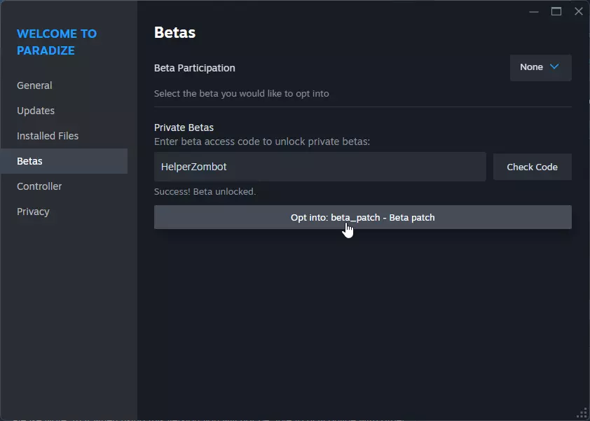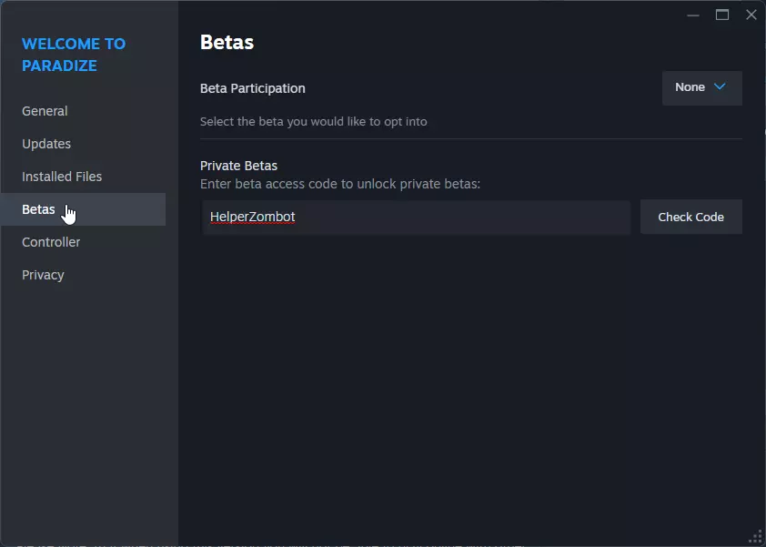 然后,在刚刚打开的属性窗口中,选择【测试版】选项。在【私人测试版】输入框中粘贴【HelperZombot】(无需输入引号),然后点击【检查代码】。