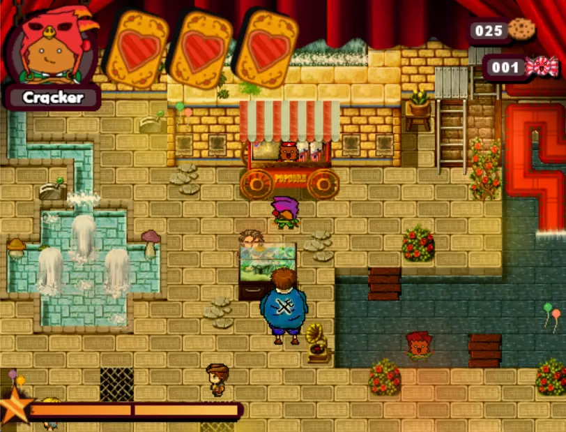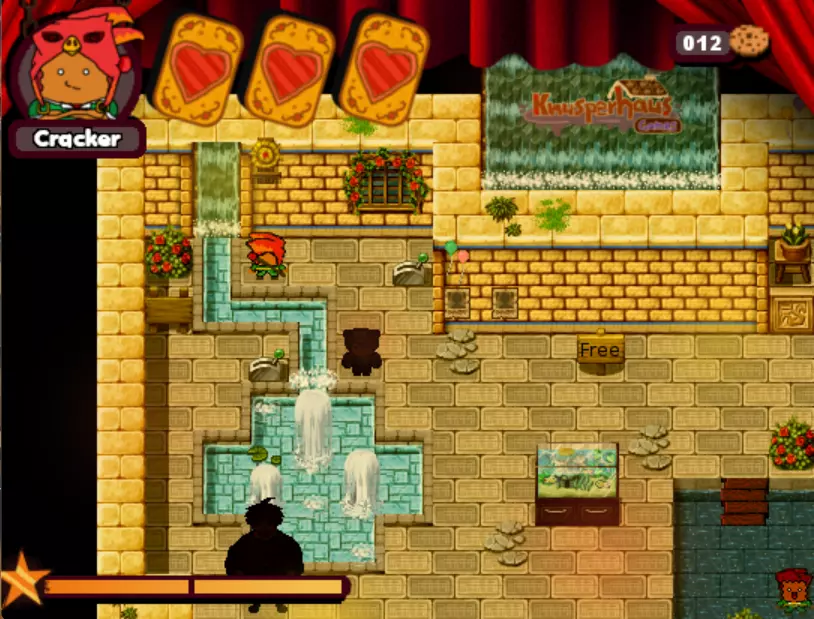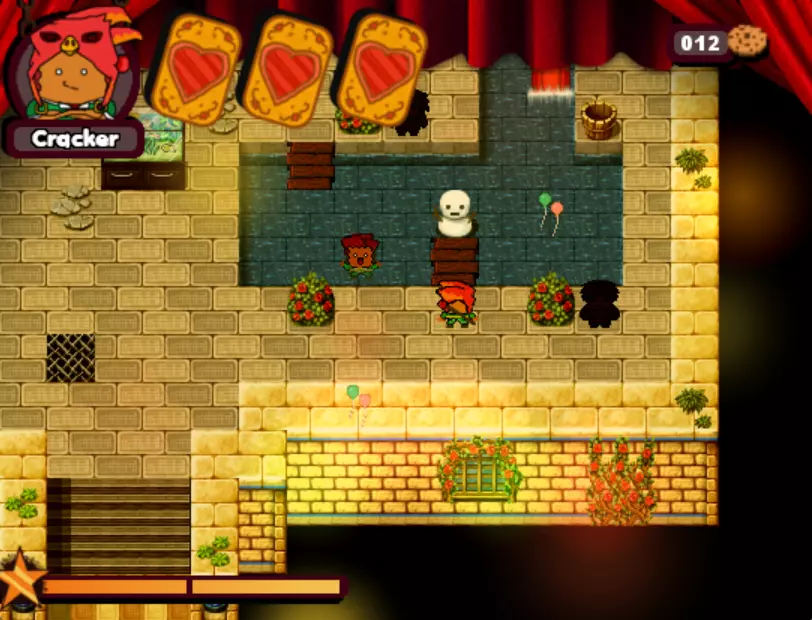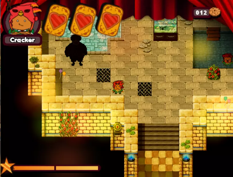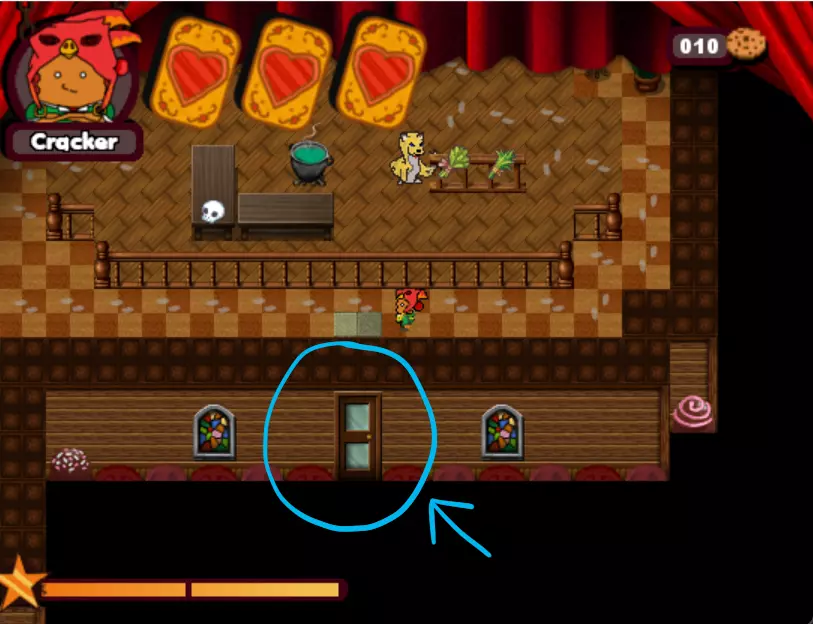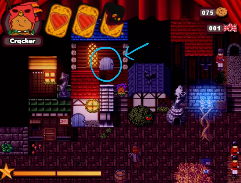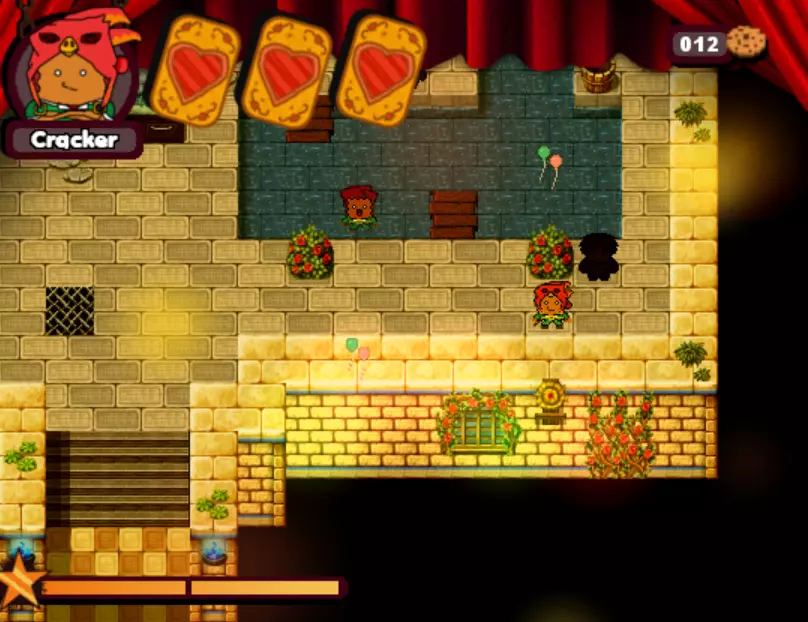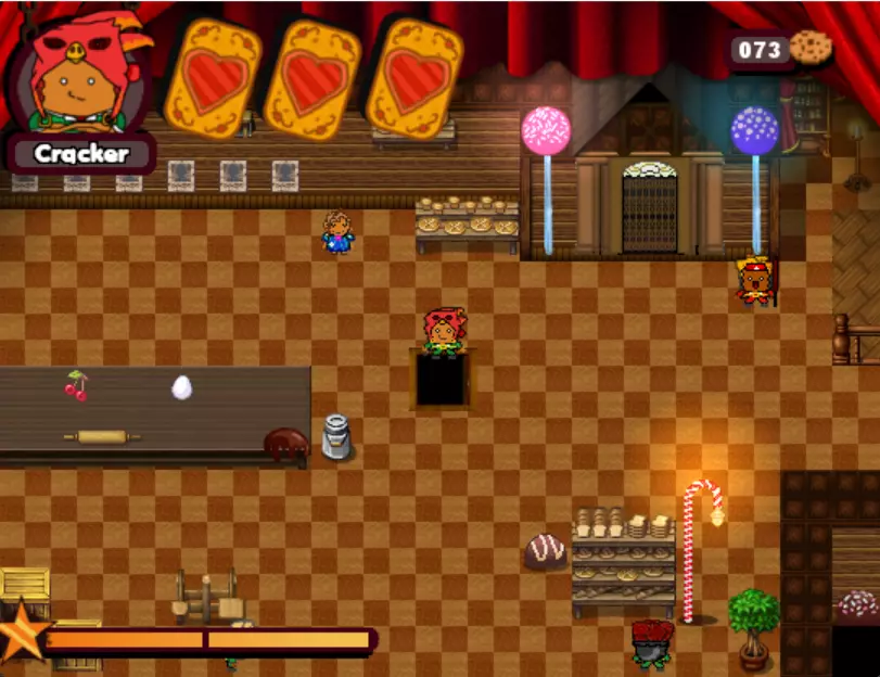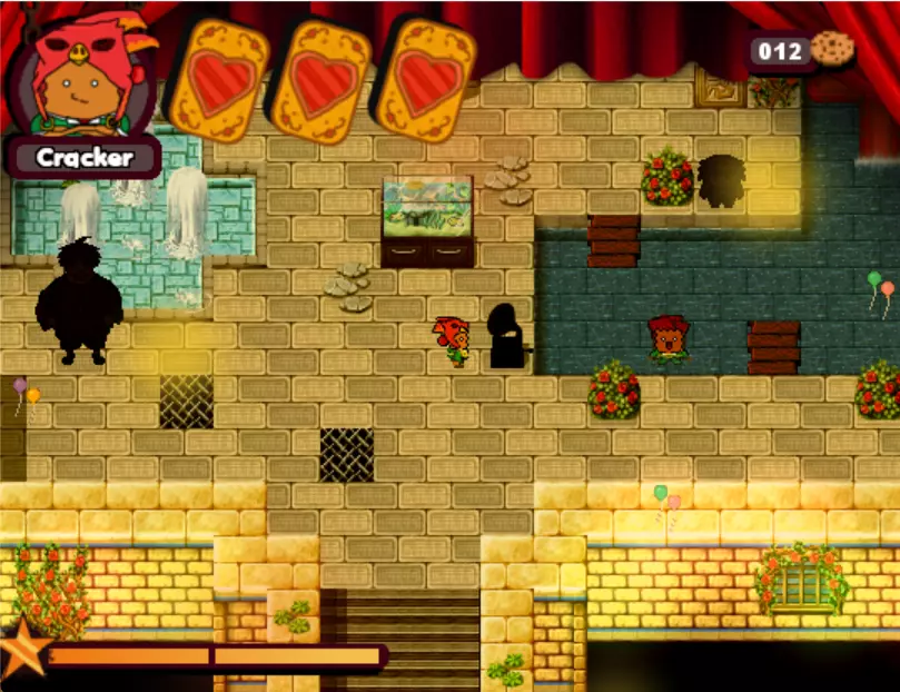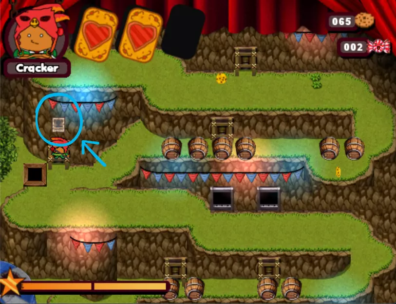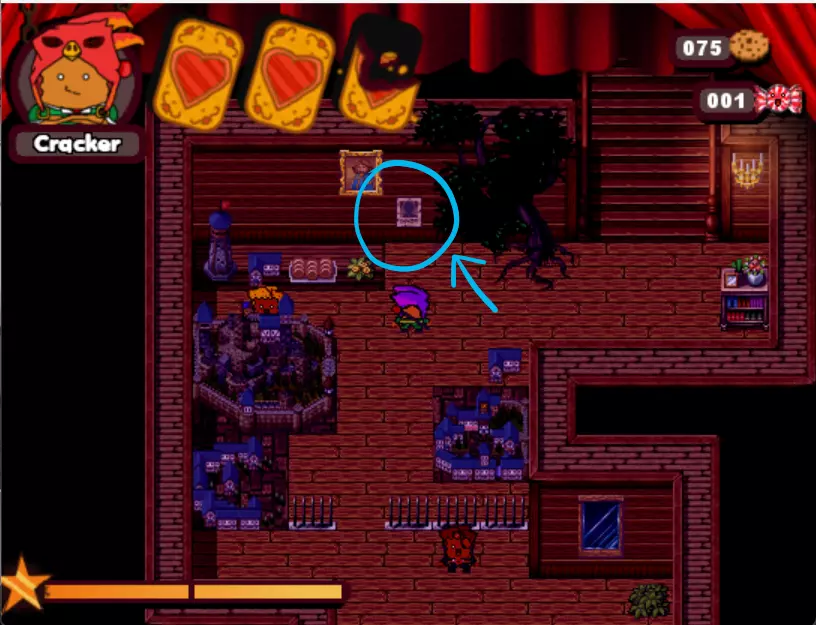 游戏中的第三个 boss。这个小孩会驾驶敞篷碰碰车来碾压你。他会沿着轨道四处移动,所以你需要在他到来之前放置圣诞爆竹(实际上是炸弹),等待他出现后立即引爆,趁他被击晕时向他射击。如此反复,直到击败他。 - What is HexCorp? (4/4) (Missable Achievement) 在城堡中与黑衣女巫交谈并获得房屋钥匙后,使用炸弹炸开前往房屋的道路。你需要向戴眼罩的爆竹支付5块饼干才能进入房屋内的大门。海报就在里面。(如果继续探索房屋,还能获得1个圣诞爆竹。注意快速移动的蘑菇。)你可以使用焦糖加农炮来减缓时间,然后向他射击,这样就能击败他。如果你已经查看了所有4张海报,成就肯定会解锁。
