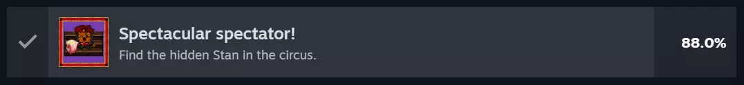 游戏场景设定在马戏团,你需要在这里玩记忆游戏。你可以在右侧的看台上找到他。他是那个戴着眼罩的小丑,几乎在所有地方都开设嘉年华游戏和表演,目的是骗取你的金钱(饼干)。与他对话,你就能获得该成就。