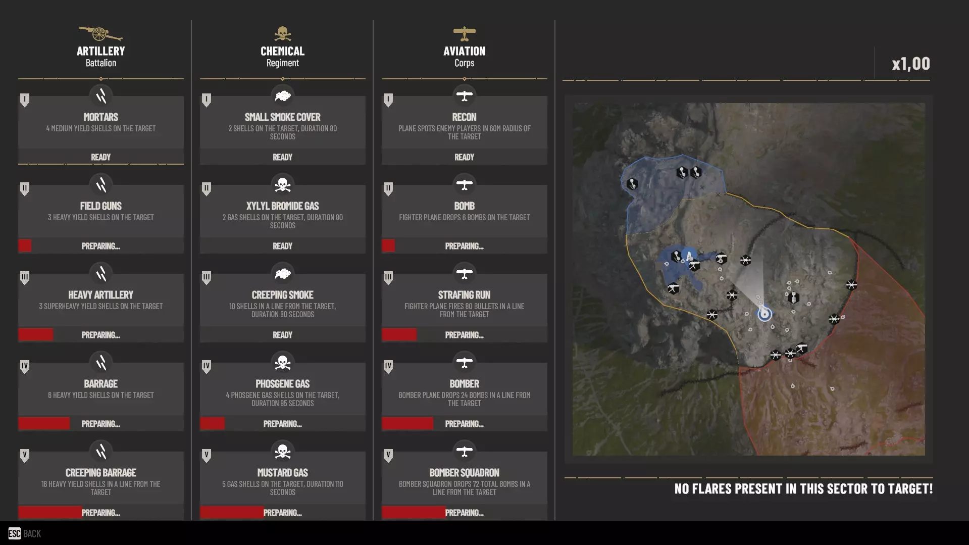 呼叫支援正是该职业的主要火力来源,只有军官能够呼叫多种不同的特殊支援,这些支援分为三类:炮兵、化学部队和航空兵。每类支援包含5种类型,且各有独立的【冷却时间】。呼叫的支援类型越弱,冷却速度越快,反之亦然。这为战术提供了灵活空间——如果用“成本更低”的烟幕弹就能掩护进攻,就不必等待芥子气攻击;但如果能用芥子气至少消灭几名敌人,也没必要在最后一个目标上浪费烟幕弹。呼叫支援的积累会根据战场形势进行计算——如果进攻方损失惨重且无法占领任何区域,那么他们军官的充能速度会加快;而防守方则可以增强支援能力,也就是说,优势会向劣势方倾斜。