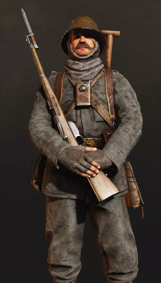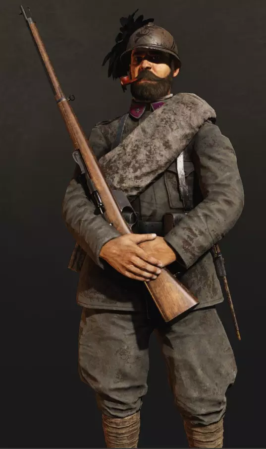 主武器仅有4种选择:3种卡宾枪和1种步枪。数量虽不多,但包含一些独特型号。分别有M.95卡宾枪、M.90卡宾枪、战利品型卡瓦列里亚骑枪Mo.91以及奥地利M.95步枪和M.14步枪。意大利方拥有卡瓦列里亚骑枪Mo.91、维特利1870/87/15 T.S.步枪、战利品型M.95卡宾枪、卡尔卡诺1891步枪和维特利1870型步枪。德国方则配备Kar.98AZ卡宾枪、Kar.88卡宾枪、G.98步枪、G.71/84步枪以及战利品型卡瓦列里亚骑枪Mo.91。 卡宾枪是基础装备,而步枪更适合那些决定在远程射击中发挥该职业潜力的玩家。 辅助装备共有5种类型: - binoculars - 登山兵的工作工具。可为全队探测并标记敌人,获取经验值。很划算。-信号弹:与军官的类似,但运作方式不同。单发会在地图上特定区域标记出所有敌人(显示其命中时的位置),双发则在标记敌人的基础上,让该区域的迫击炮立即获得较小的散布范围。此外,它还会像军官的信号枪一样为军官添加标记。这是个强大的物品。 -水壶:与军官和突击兵的相同。喝一口,我们的士兵就能消除疲劳。 -冰镐:配合速度相关的技能后,简直是消灭敌人的利器。如果登山兵带着冰镐成功绕到敌人后方,那麻烦就大了,你会听到持续不断的敲击声。 -号角:我们的勇士也会吹号角。号角可持续短时间(效果结束后约十秒即可再次使用)在士兵周围生成光环,提升拉栓速度、装填速度和移动速度。无论是对自身还是团队都非常有用。