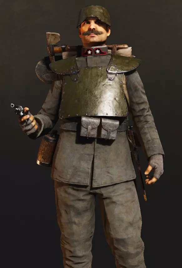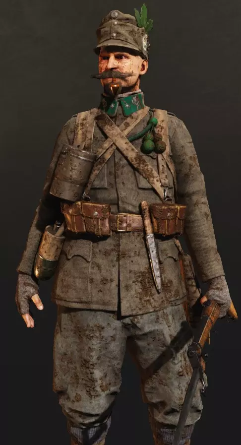 基础武器限定为4种类型:卡宾枪(M91/M95/Kar.98AZ)、手枪(伯莱塔M1915/斯泰尔-哈恩1912/P08鲁格)、轻机枪(维拉尔·佩罗萨/麦德森/MG08/15)以及战利品卡宾枪(M95和M91)。不难看出,这些武器主要适用于近距离战斗,虽然选择不多,但各有特点。 辅助装备有4种选择: - 水壶:与军官的相同。如果你需要进行侧翼机动并大量奔跑,这个很合适。 - 两种手榴弹(默认各2枚),通过不同测试解锁——意大利方为巴尔达里手榴弹和斯帕卡梅拉OSP手榴弹,奥地利方为 Rohrhandgranate(alt)和 Rohrhandgranate(neu)手榴弹,德国方为M1917柄式手榴弹和M1917卵形手榴弹。这是突击兵最重要的武器。近战武器 - 意大利方配备【 Arditi 匕首】,奥地利方配备【战锤】,德国方配备【战壕刀】。用于打乱敌方阵型。