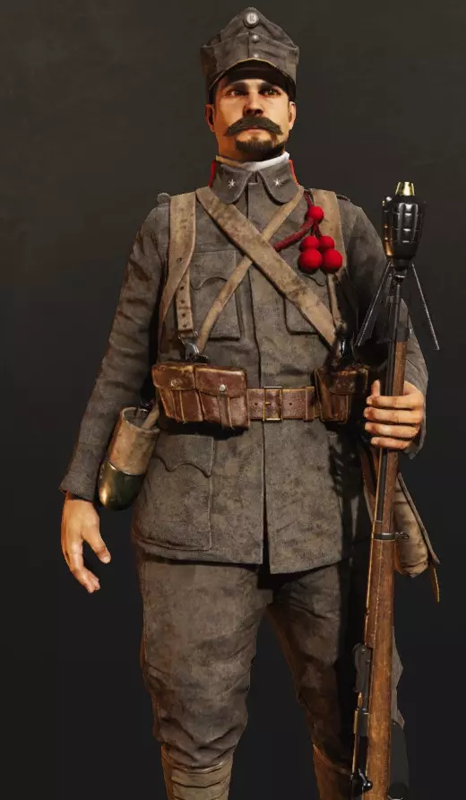 武器组合可以说是:步枪、步枪、步枪……还是步枪?没错,意大利方有卡尔卡诺M1891、维特利M870/87/15、带枪榴弹的卡尔卡诺M1891、维特利-维塔利M870/87以及战利品M.95带枪榴弹版本。奥地利方有M.95、M.88-90、带枪榴弹的M.95、M14式 repeater步枪、M.13以及缴获的带枪榴弹的卡尔卡诺M1891。德国方有G.98、G.88/05、带枪榴弹的G.98、独特的带战壕弹匣(20发容量)的G.98,以及战利品带枪榴弹的卡尔卡诺M1891。 可以说,各有各的特色。需要说明的是,枪榴弹默认配备3枚,弹道相当弯曲,而且这些武器组合没有配备刺刀。此外,安装枪榴弹的过程也不算快。作为回报,你将获得在较远的距离投掷手榴弹而不被敌人击中的能力。这是一把在高手手中令人生畏的武器。 支援装备栏只有2个位置,但可以携带弹药箱或单个手榴弹。弹药箱是波里谢尔真正的秘密——它非常有用,但并非所有人都注意到。携带弹药箱可以让你为自己或任何队友补充弹药(以及信号弹的弹药),并获得分数。此外,你还可以为固定机枪、火炮和迫击炮补充弹药,这才是最主要的价值所在。当然,在为固定武器补充完弹药后,有一分钟的充能冷却时间,但相比能在整场战斗中用迫击炮持续骚扰敌人,这只是个小问题。另一方面,手榴弹……除了能补充你所需的一切外,是攻防作战中最需要的东西。奥军有【罗尔手榴弹(Alt型)】,意军有【巴尔达里手榴弹】,德军有【M.16型柄式手榴弹】。