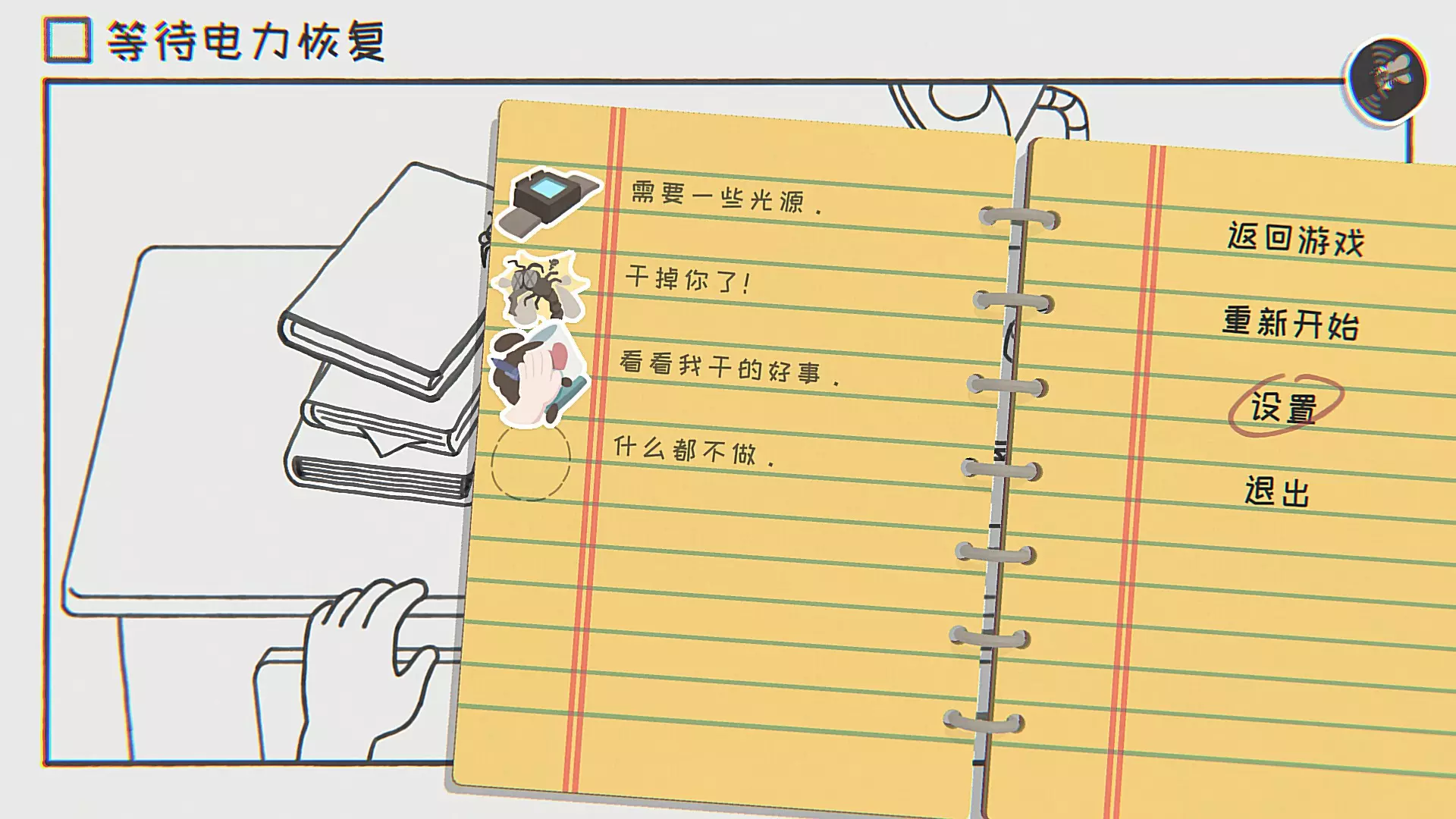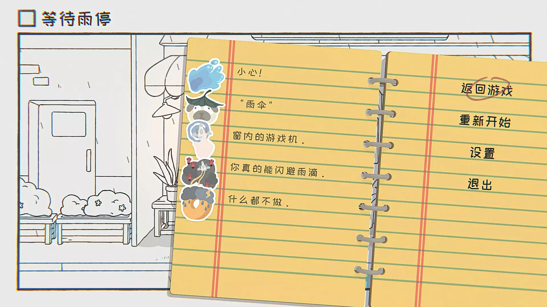 解开不可解的结:从桌上拿起笔进行迷宫连线,若正常走迷宫无法通过,在迷宫外连接即可。 你的智商超越了99%的人:先查看手上的教科书(否则第一个问题没有正确答案),然后将摇杆向上推举手,回答老师问题:0,2苹果,13,2H₂O,4,天使(需要不停往后翻书)。 挖掘抽屉深处:游玩抽屉消除小游戏,最后会看到一部手机。 什么都不做:什么都不做。 第六关 等待雨停