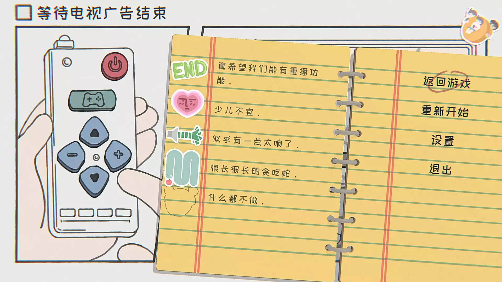 真希望我们能有重播功能,关闭电视或者切换频道都可以,过一段时间再调回频道就行。 少儿不宜,切到播放接吻画面的电视剧频道。 音量似乎有点太响了,调到最大后切到促销频道。 在电视机贪吃蛇游戏中,操控很长很长的贪吃蛇,分数超过17。 什么都不做。 第十关 等待英雄救场