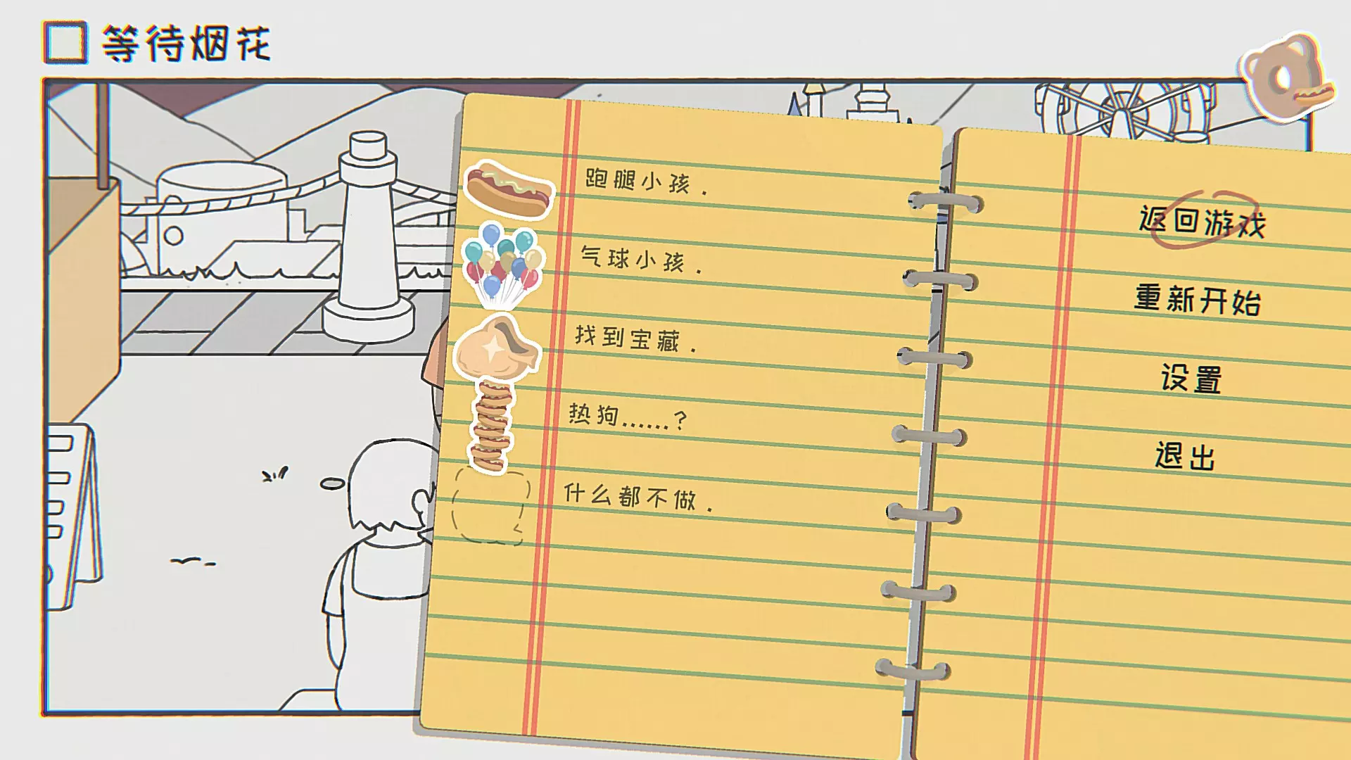 跑腿小孩和父母对话,获得钱去买热狗,买三个热狗后回到父母身边。 气球小孩买两串气球后飞起。 找到宝藏并贴上一个贴纸,买两串气球飞起来后向左飞,飞到指路牌位置时让气球被鸟扎爆,掉落在热狗摊摊顶。 热狗……?贴上一个贴纸,用从宝藏里拿到的钱加上地上的钱,买八个热狗。 什么都不做。 第二十关 等待热水