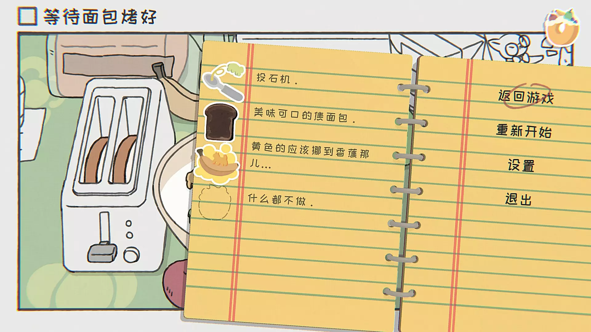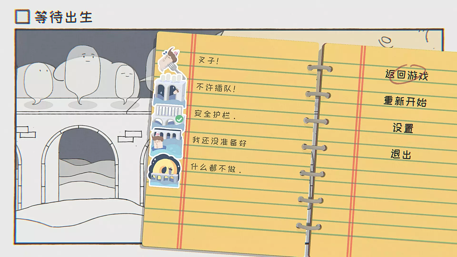 叉子:控制主角掉进河里,顺着水流从左边岔路漂走。 不许插队:控制主角在桥上一路超越其他灵魂,被其他灵魂挤下去后即可触发。(注意容易掉下去) 安全护栏:控制主角跳下桥。(需要按交互键才能进行“跳”) 我还没准备好:控制主角掉下桥时掉落在河面小船上。 什么都没做:什么都不做。 第三关:等待面包烤好