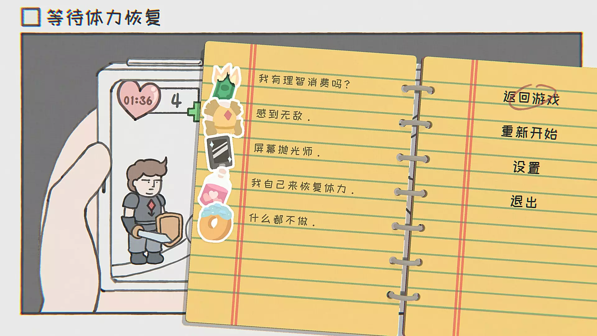 我有理智消费吗?点击钻石旁边的加号,充值最贵的档位直到把家长卡刷爆。 感到无敌:充值钻石到4400颗(也差不多是家长账户可充值极限了),十一发十连才会凑齐一套黄金装备。 屏幕抛光师:按下红色按键,用手指将屏幕擦干净。 我自己来恢复体力:先在游戏主界面点飘过来的金币到3500,之后点击宝箱界面,在宝箱界面(只有在这个界面里时间可以一直延续,不然在游戏主界面满了五颗心本关卡自动结束了)里点击金币旁边加号,第一段广告中间会卡顿,无视它继续等,最后会观看失败,然后继续看第二段广告,顺利看完后金币达到5000,就可以在这个界面里点击心旁边的加号买体力药了。第八关 等待晚餐